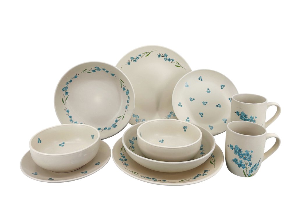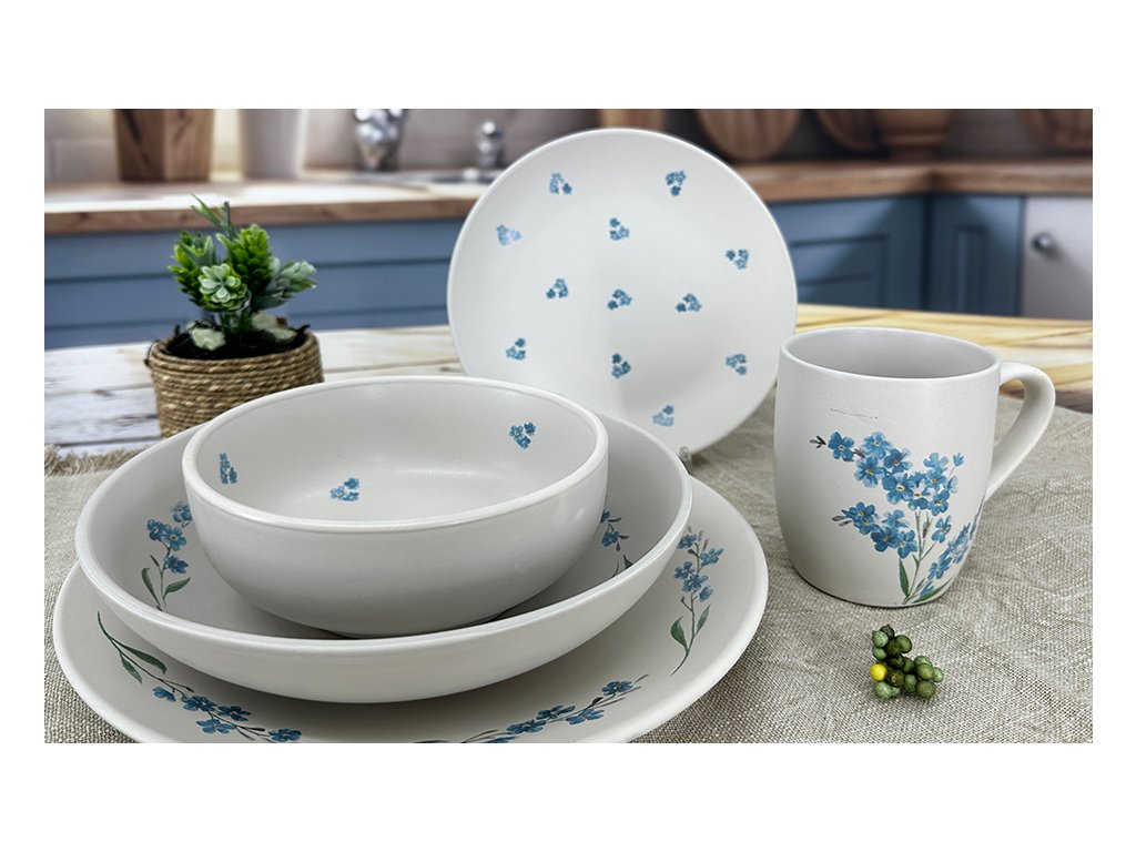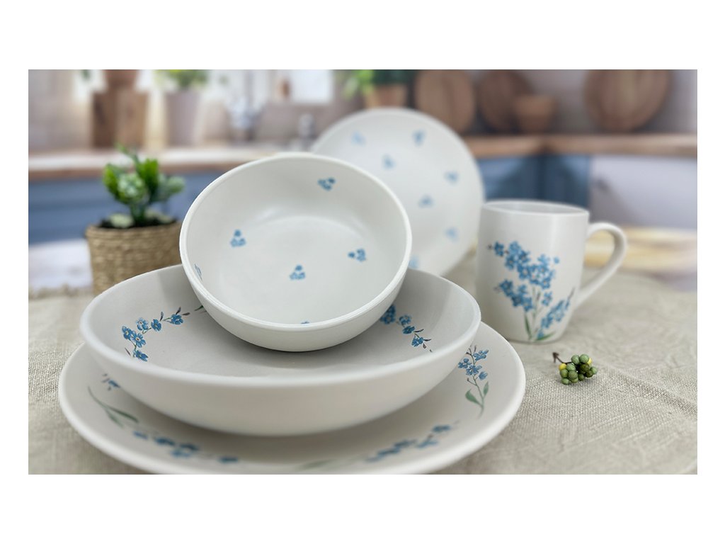 Jídelní keramická souprava Cream Pomněnka je ideální volbou pro milovníky keramického nádobí, kteří ocení jemný květinový dekor a přírodní vzhled. Decentní motiv keramického nádobí s květinovým dekorem v modrých tónech přináší do každodenního stolování svěžest a harmonii.