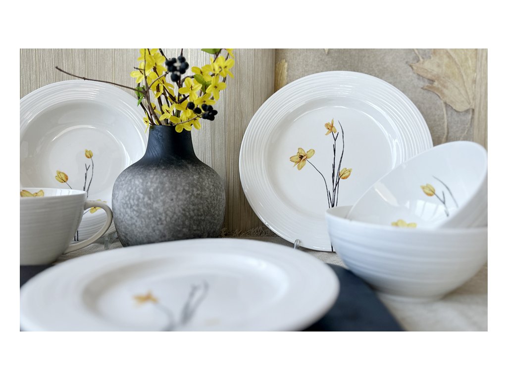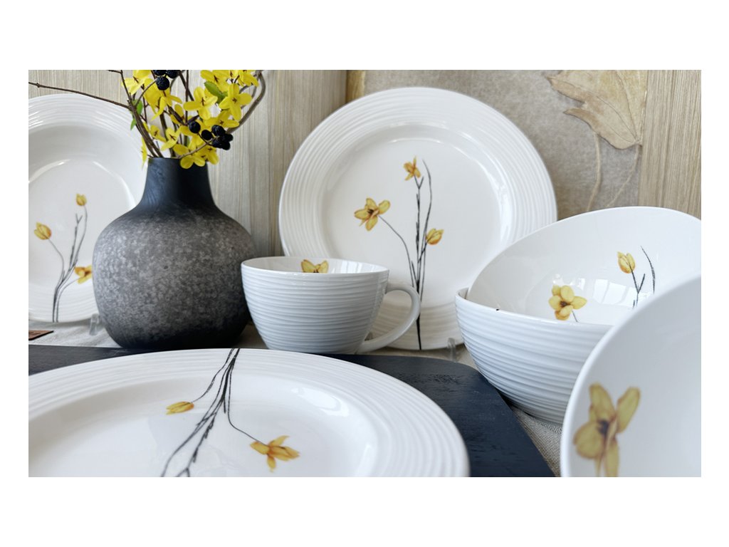 Jídelní sada Croft Spring přináší do vašeho domova svěžest jara a jemnou eleganci. Porcelánová jídelní souprava je inspirována krásou přírody a vyniká čistým designem s embosovanými okraji a jemným květinovým motivem v žlutých a černých tónech. Porcelánové talíře mají zdobené okraje, zatímco misky a hrnky jsou embosované po celé vnější straně.