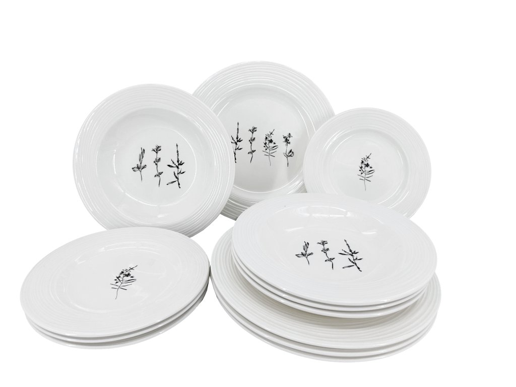 Porcelánová sada talířů Croft Wild – oslava krásy přírody, která přináší klid a jemnost lučních květin přímo na váš stůl. Tato porcelánová jídelní souprava propojuje minimalistický design s jemnými černými siluetami květin, které dodávají nádobí lehkost a eleganci.