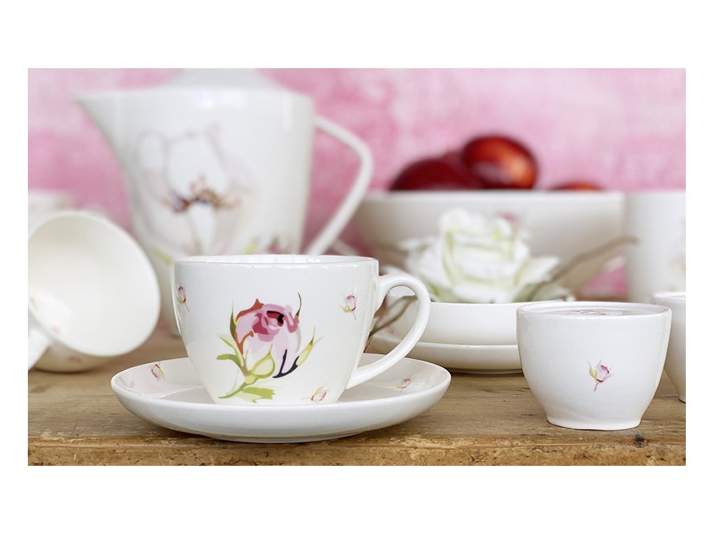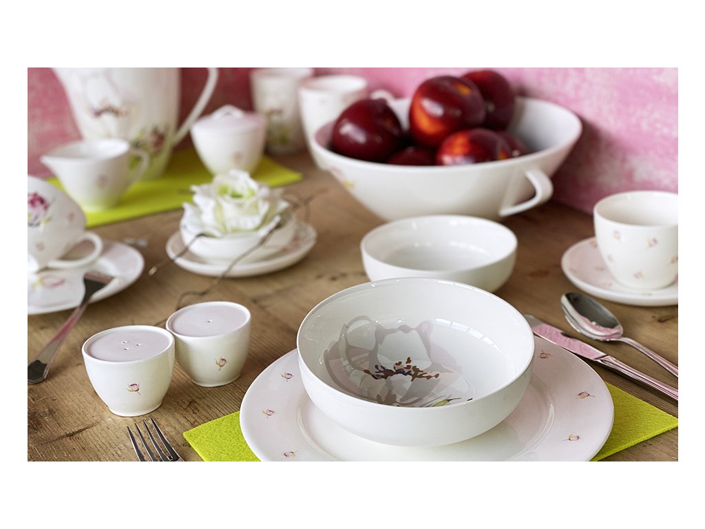 Dekor květu růže a malých růžiček, spolu s růžovou a zelenou barvou, vytváří romantickou a uklidňující atmosféru, která se stane dokonalým doplňkem pro váš jídelní stůl a interiér. Kolekce Fine Poetica je zde, aby vám přinesla krásu přírody a jedinečný český šarm.