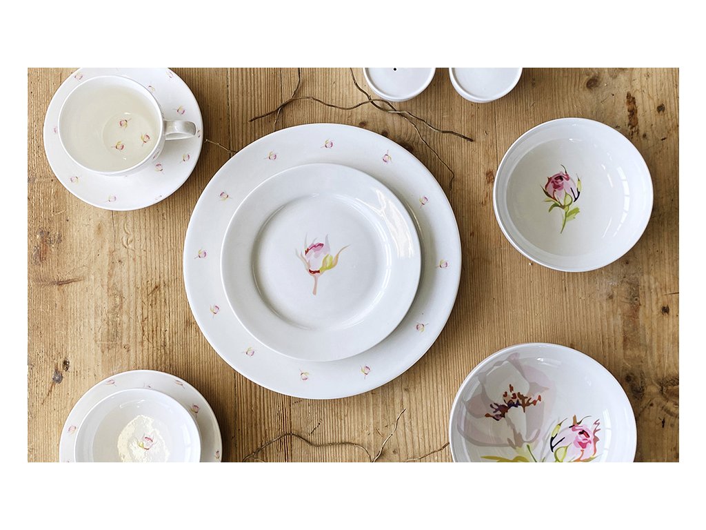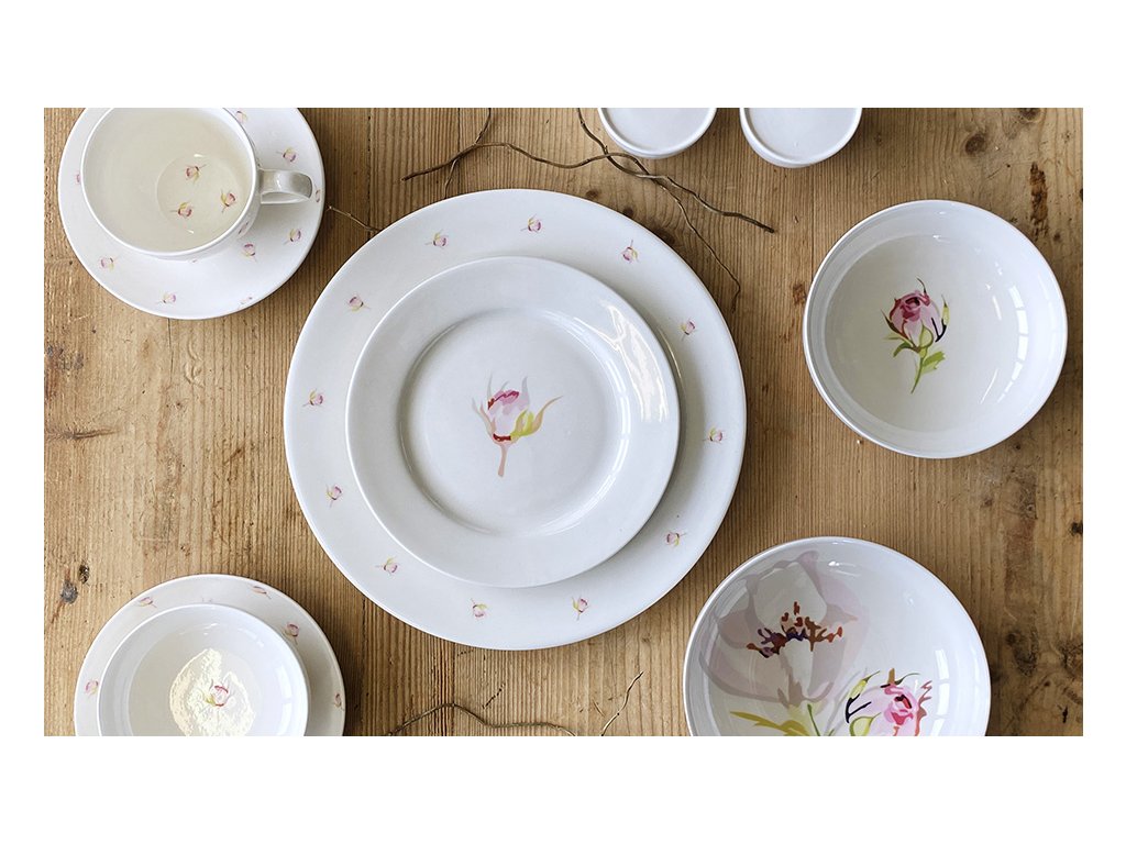 Středobodem této kolekce jsou kulaté bílé talíře, které jsou zdobeny dekorem růže nebo malých růžiček. Nádherný dekor je kombinací jemné růžové a osvěžující zelené, což vytváří kontrast, který působí harmonicky a dodává talířům zvláštní šarm. Každý talíř je ručně zdoben a vytvořen s maximální pozorností k detailům, což zajišťuje jedinečný vzhled.