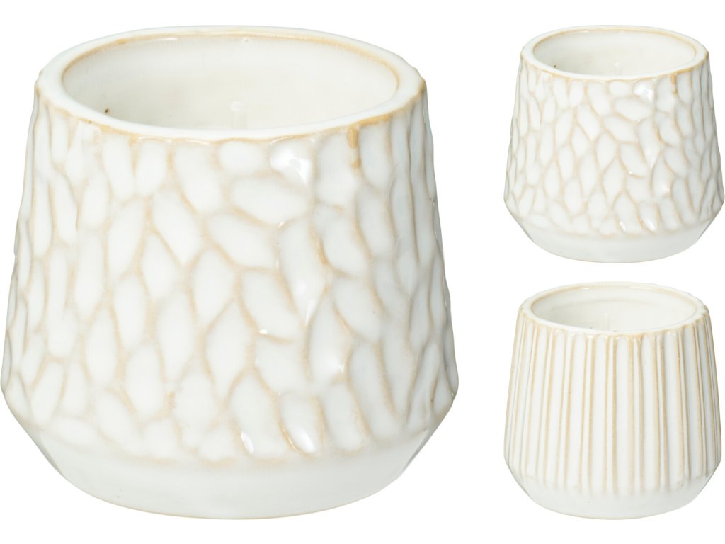 Aromatická svíčka s pruhy v porcelánovém kelímku, bílá reaktivní glazura (7x7x6 cm)