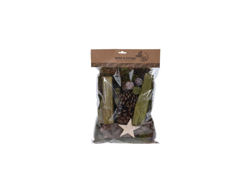 Balíček dekorací, sušený mech, kůra a šišky, zelená