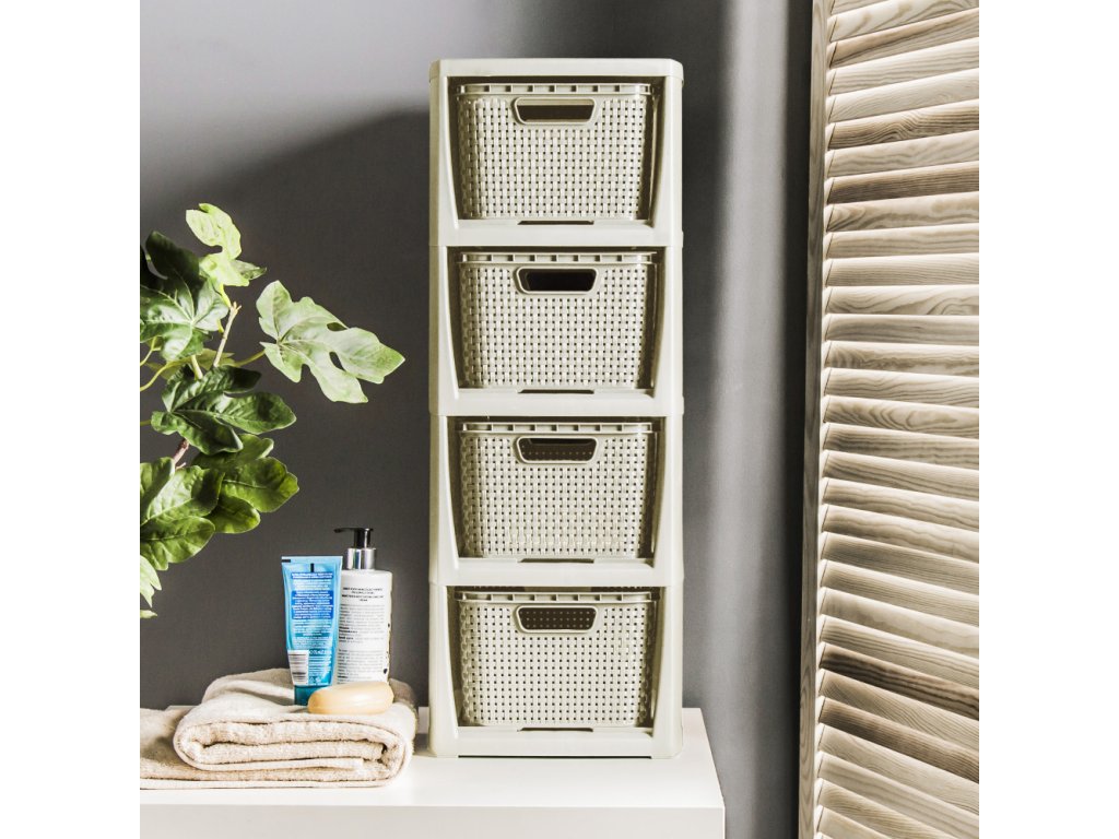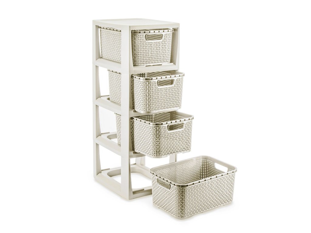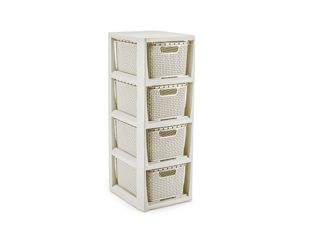 Plastová komoda Rattan je velmi dobré řešení pro uskladnění v malých prostorách. Vyrobeno z kvalitního plastu (bez ftalátů) je ideální pro místnosti jako koupelna, šatna, dětský pokoj nebo domácí kancelář . Rozměr stojanu: 64,3 x 24 x 29,5 cm , čtyři vyjímatelné košíky. Rozměr koše - 13 x 19 x 28,3 cm. Elegantní barevné provedení v antické bílé.