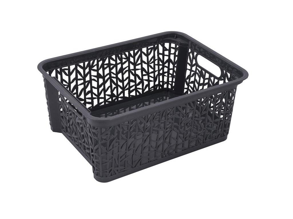 Plastový košík originálního vzhledu s motivem bambusových větviček a listů. Bambusové koše se tak stanou ozdobou Vaší domácnosti. Konstrukce košů umožňuje jejich stohování jeden na druhého díky speciálně navrženým hranám po stranách. Košík je perfektním řešením pro udržení pořádku v kuchyni, koupelně, dětském pokoji. Rozměry: 29 cm x 22 cm x 12 cm. Antracitová barva.