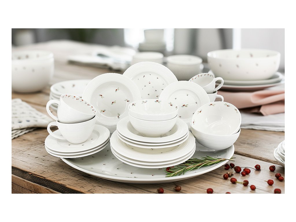 Elegantní čajová souprava Berries je dokonalým doplňkem pro vaše chvíle pohody. Jemný vzor bobulí v zeleno-červených tónech přináší do interiéru harmonii a přírodní eleganci. Tato porcelánová souprava na čaj je nejen krásná, ale i praktická – ideální na každodenní použití i slavnostní servírování.