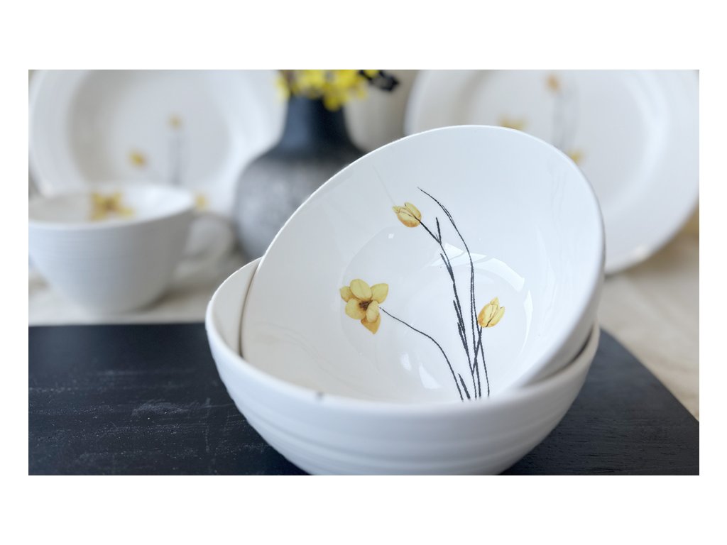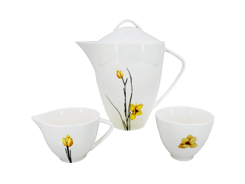 Design soupravy je inspirován jemnou krásou jarních květin. Každý kousek je zdoben elegantním motivem žlutých květů, který dodává nádobí svěžest a přírodní harmonii. Konvice má ergonomicky tvarovanou rukojeť a praktickou výlevku pro pohodlné nalévání. Mléčenka je vybavena ouškem a tvarovaným hrdlem pro snadné dávkování mléka nebo smetany. Cukřenka s víčkem chrání cukr před vlhkostí a zachovává jeho čerstvost.