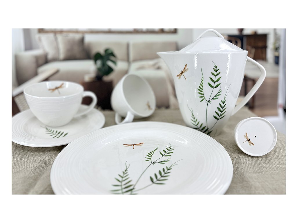 Porcelánová konvice vyniká sofistikovaným designem, doplněným jemným dekorem vážky a přírodních listů, který dodává servírování čaje elegantní a uklidňující atmosféru. Mléčenka a cukřenka perfektně ladí s touto konvicí a společně tvoří esteticky vyváženou čajovou sadu, která obohatí váš domov o přírodní harmonii.