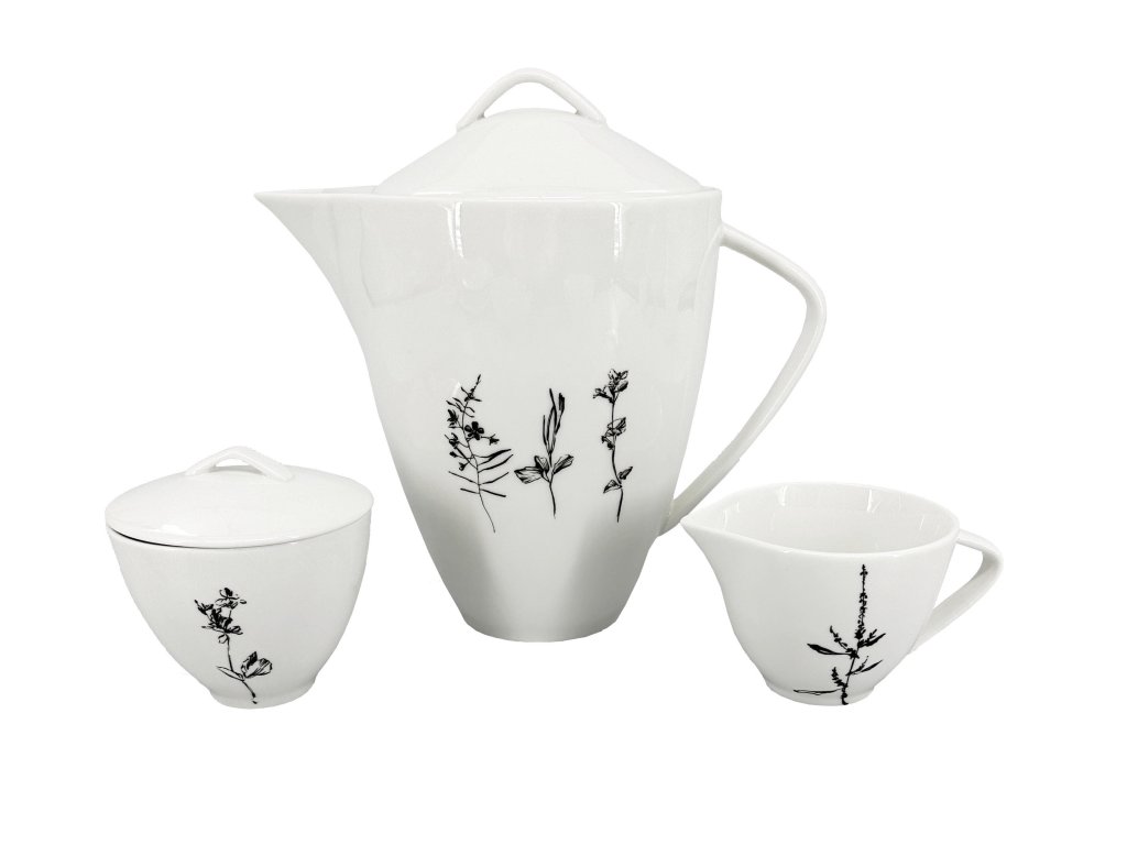 Každý kus je pečlivě navržen s důrazem na detail. Porcelánová konvice je zdobena černými květinami na přední straně, mléčenka a cukřenka nesou jemný květinový dekor, který je harmonicky sladěn se zbytkem kolekce. Tato souprava je ideální nejen pro běžné chvíle u čaje, ale i pro slavnostní příležitosti.