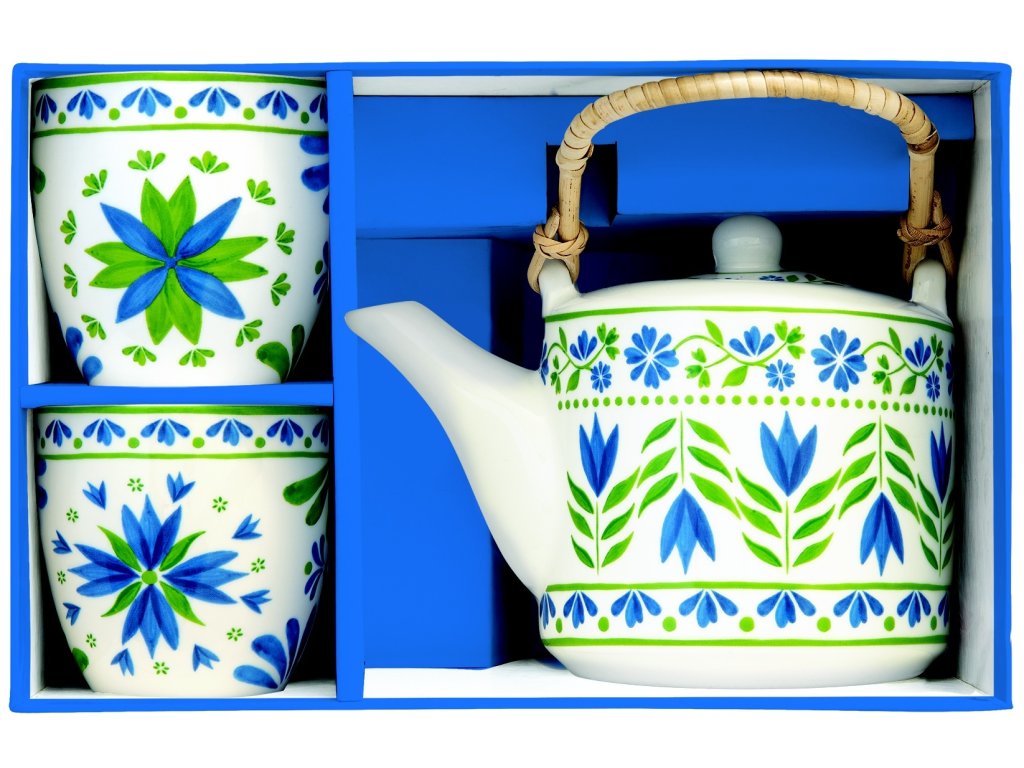 Čajová konvička a pohárky Flowers Garden jsou zdobeny jemnými modrými kvítky, které zahrnují květiny, listy a rostlinné vzory. Každý detail zdobení přináší do této čajové sady dojem svěžesti a přírodní krásy, což z ní dělá nejen funkční, ale i dekorativní prvek pro každý čajový rituál. Sada obsahuje dva pohárky na čaj, konvičku a čajové sítko. Objem hrnku je 160 ml a konvičky 600 ml.