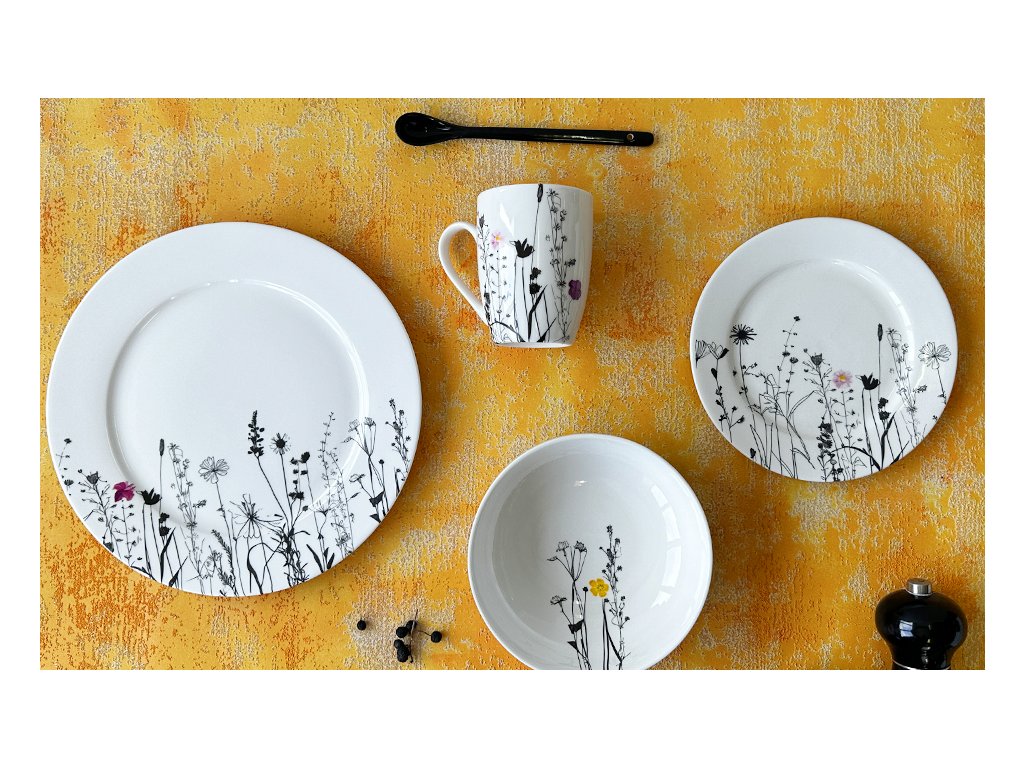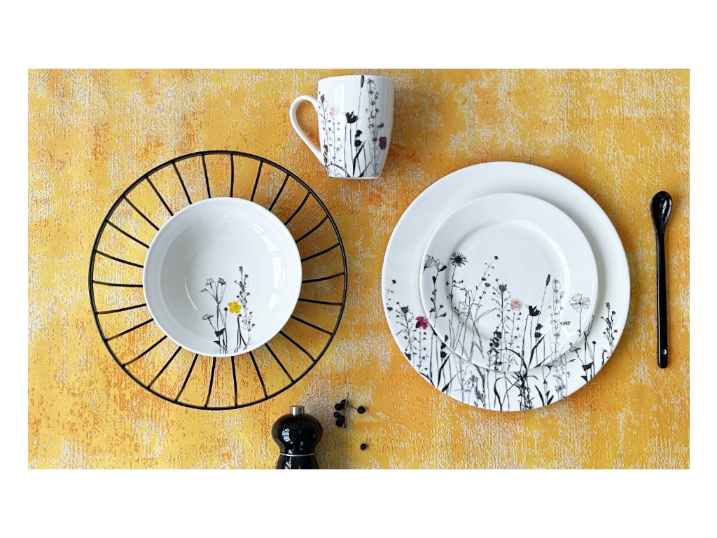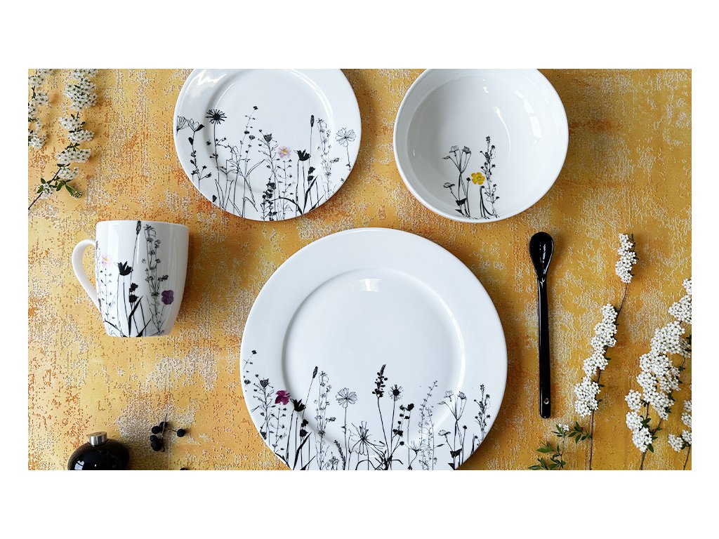 Kolekce Garden od české značky by inspire nabízí elegantní porcelánovou jídelní soupravu, jednotlivé talíře, misky a hrnky s motivem lučního kvítí a travin v černé barvě. Kolekce kombinuje jednoduchost bílého porcelánu s detailním a elegantním dekorem, který připomíná krásu přírody. Je vhodná pro každodenní použití i pro speciální příležitosti a splňuje potřeby servírování různých druhů jídel a nápojů.