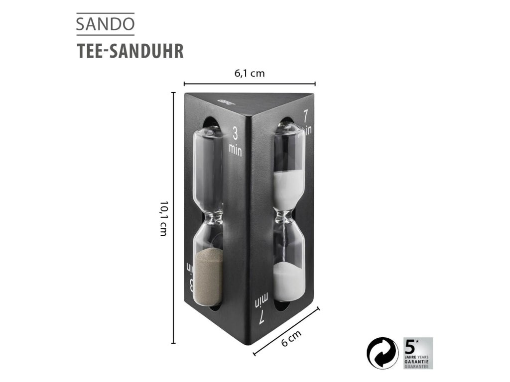 Uvařte si čaj s přesností! Ať už je to zelený, černý, bylinkový nebo ovocný čaj – s našimi čajovými přesýpacími hodinami se každý šálek stane potěšením. Snadno odměřte perfektní dobu louhování. Otočte SANDO, sledujte požadovanou barvu přesýpacích hodin a poté si vychutnejte plné aroma čaje. Naše čajové přesýpací hodiny nejsou jen perfektním společníkem pro všechny milovníky čaje, ale také všestranným nástrojem v kuchyni. SANDO lze například použít i k přesnému měření času uvaření vejce naměkko.