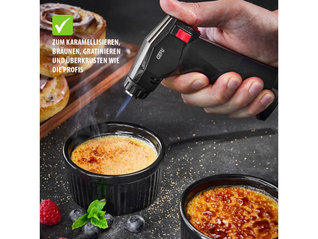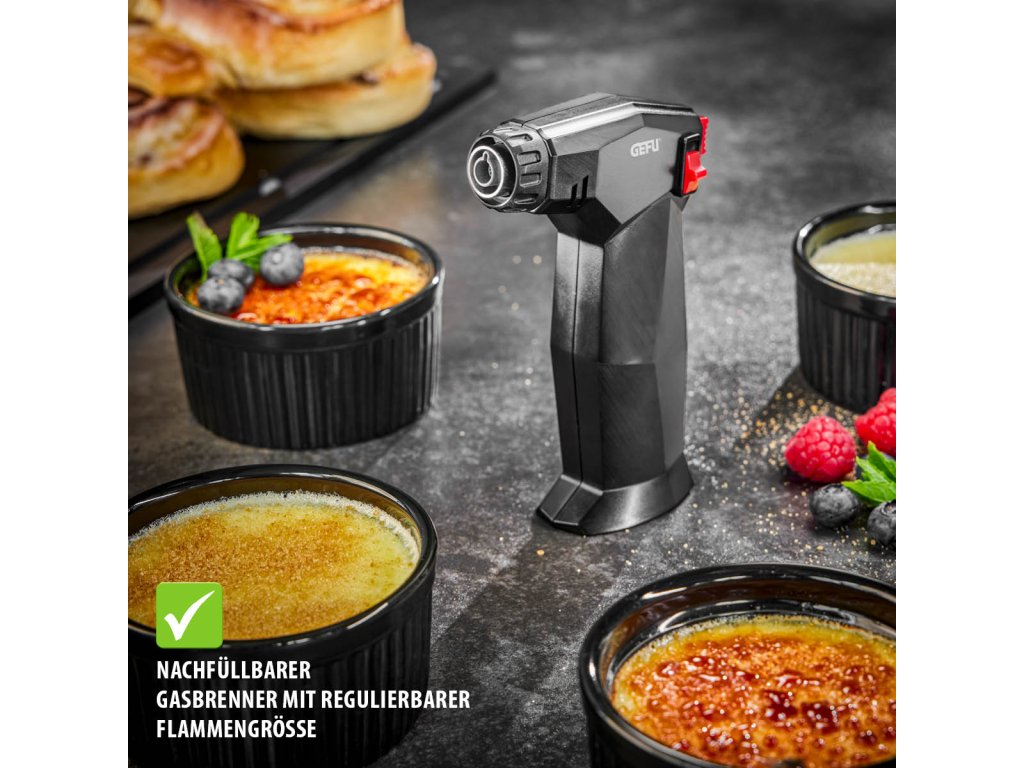 Pro klasické crème brûlée, ale také pro jemně gratinovaný kozí sýr, pro karamelizaci citronového koláče nebo pro přípravu parmazánu ze strouhaného sýra: hořák na crème brûlée má širokou škálu využití.
