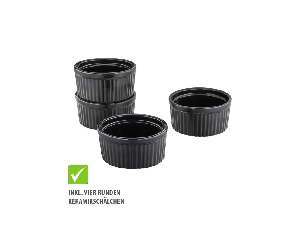 Sada obsahuje čtyři kulaté keramické misky pro klasické crème brûlée – ale jsou také ideální pro servírování gratinovaného kozího sýra, ozdobeného trochou rukoly a fíkové hořčice! Hořák je samozřejmě vybaven dětskou pojistkou! A robustní základna zajišťuje, že si najde své místo na kuchyňské poličce.