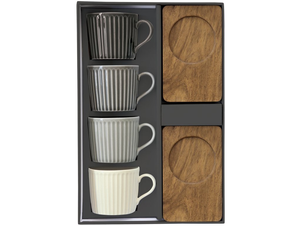 Sada čtyř porcelánových šálků a podšálků Take A Break Design 6 je ideální volbou pro milovníky stylového stolování. Kombinuje moderní design, kvalitní porcelán a přírodní akátové dřevo. Výsledkem je funkční i esteticky působivý set, který ozdobí každý stůl. V balení najdete čtyři porcelánové šálky o objemu 110 ml a čtyři podšálky z akátového dřeva. Každý hrnek má jiný odstín. Tři šedé tóny doplňuje jeden elegantní bílý hrnek. Celá sada je uložena v dárkové krabičce. Díky tomu je připravena k okamžitému darování. Porcelánové šálky v neutrálních barvách snadno sladíte s moderní i klasickou kuchyní. Šedé odstíny působí decentně, bílý hrnek dodává celku jemný kontrast. Akátové podšálky podtrhují přírodní krásu sady a dodávají jí jedinečný charakter. Každý hrnek má objem 110 ml, což je ideální velikost na espresso, cappuccino nebo čaj. Porcelánové hrnky jsou odolné a snadno se udržují. Můžete je bez obav dát do myčky na nádobí i do mikrovlnné trouby. Dřevěné podšálky jsou naopak určeny pouze k ručnímu mytí.