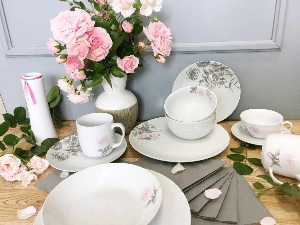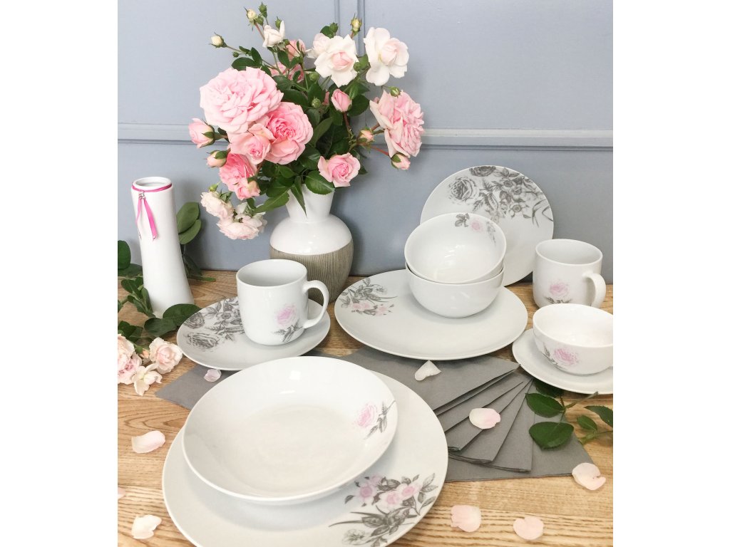 Kolekce Rose české značky by inspire s motivy růží v šedorůžové kombinaci je elegantní a slavnostní. Tato růže Vám nikdy neuvadne a vždy potěší při každé příležitosti u prostřeného stolu.