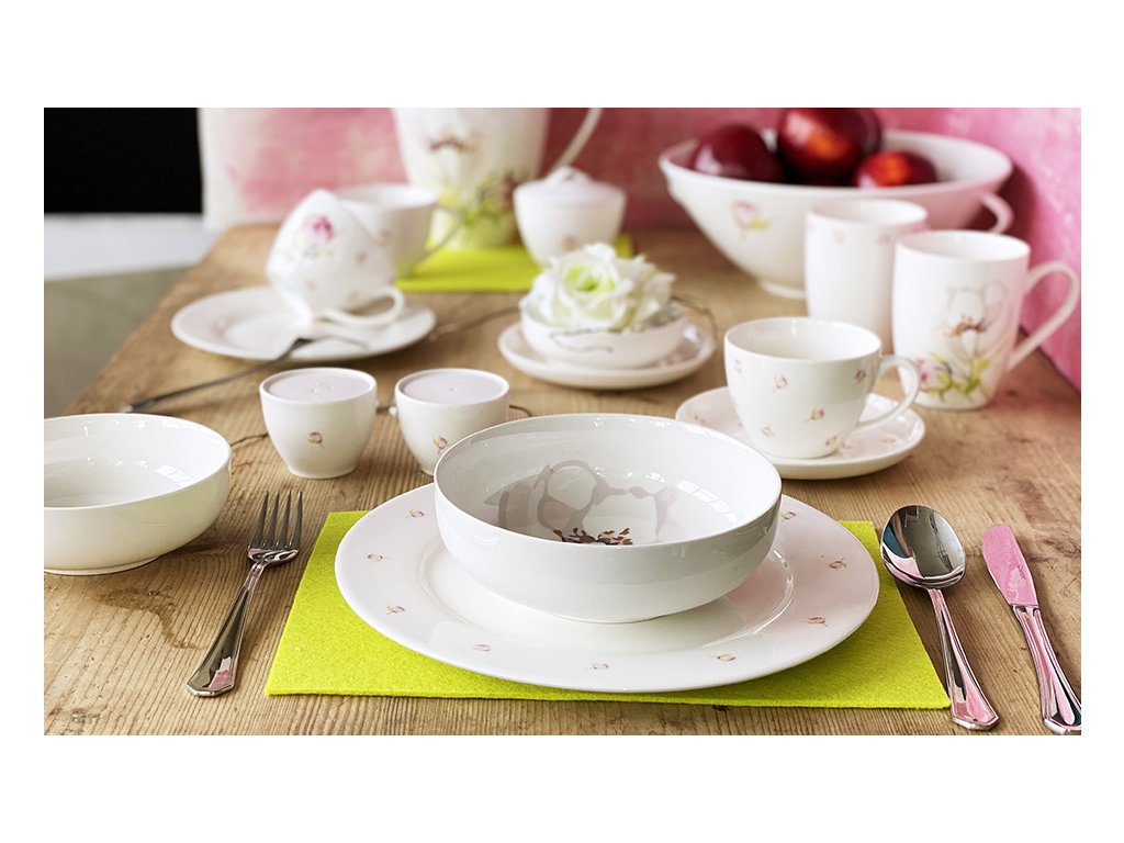 Středobodem této kolekce jsou kulaté bílé talíře, které jsou zdobeny dekorem růže nebo malých růžiček. Nádherný dekor je kombinací jemné růžové a osvěžující zelené, což vytváří kontrast, který působí harmonicky a dodává talířům zvláštní šarm. Každý talíř je ručně zdoben a vytvořen s maximální pozorností k detailům, což zajišťuje jedinečný vzhled.
