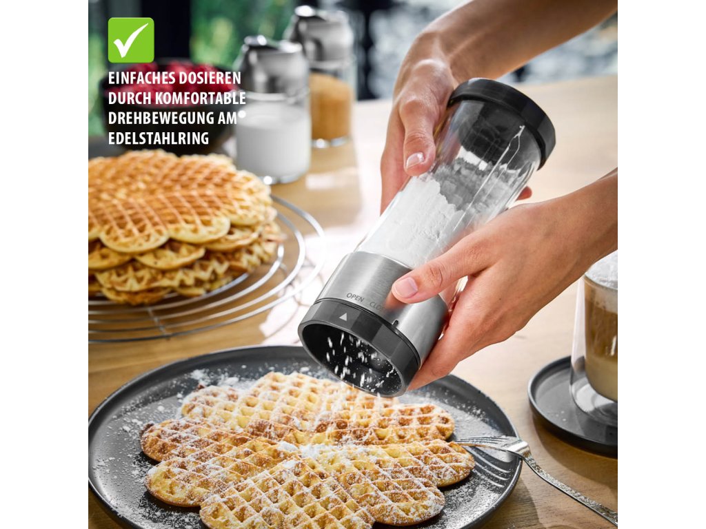 DISPENSO byl speciálně vyvinut pro každého, kdo si chce snadno odměřit jemný moučkový cukr nebo kakaový prášek, který se rozpouští v ústech. Jednoduše vyjměte mlýnek na moučkový cukr ze skříňky, otevřete otočný zamykací mechanismus na spodní straně a posypte čerstvým moučkovým cukrem vafle, dorty nebo jiné pochoutky. Průhledná nádoba poskytuje přehled o zbývajícím obsahu a usnadňuje doplňování – moučkový cukr nebo kakaový prášek máte vždy po ruce, kdykoli je potřebujete.