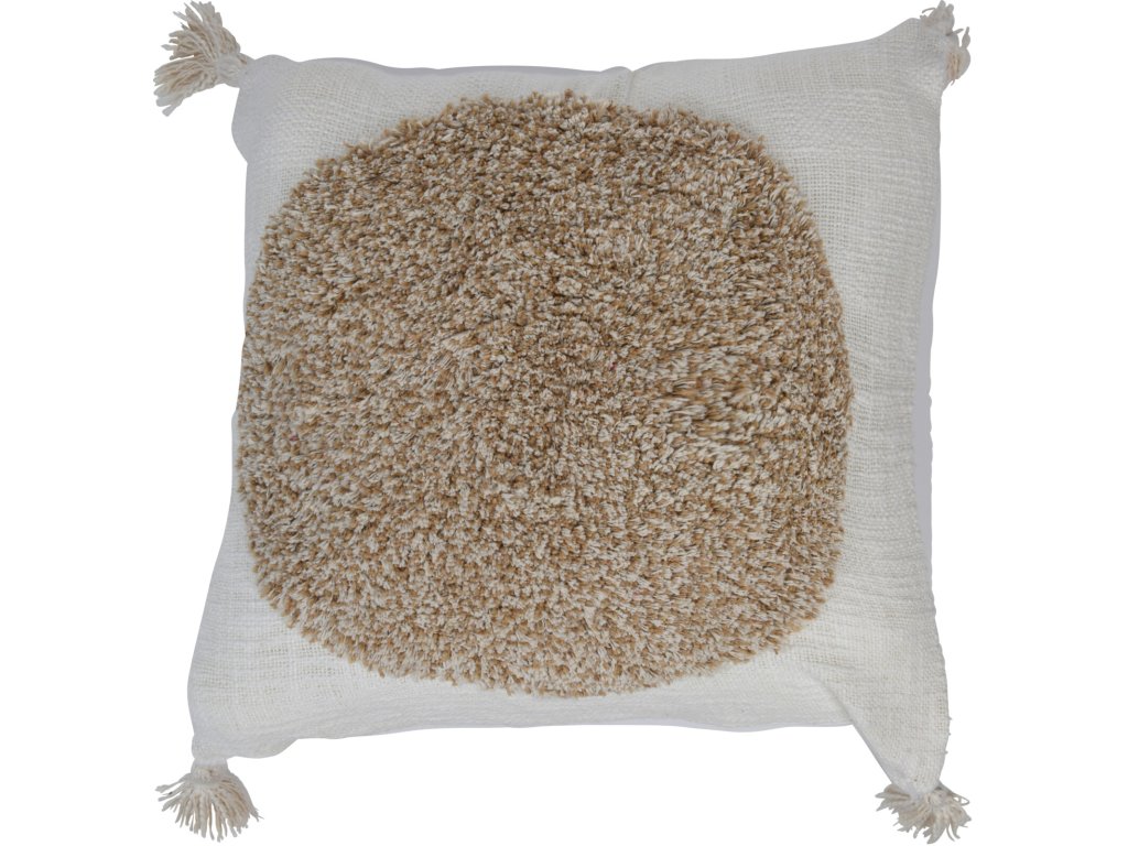Přírodní dekorační polštář. Bílý polštář se střapci v přírodní barvě. Polštář je dekorovaný přírodním delším vláknem ve tvaru kruhu. Pokud potřebujete rychlou a malou změnu u vás doma. Nový polštář je správnou volbou, změní styl vašeho interiéru.