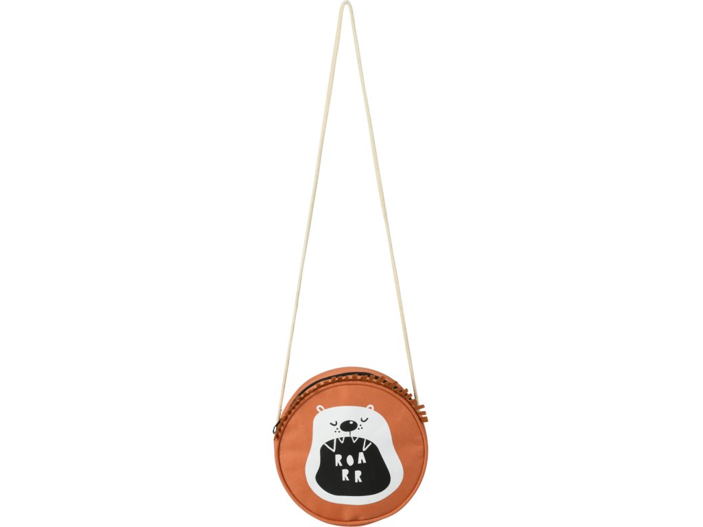 Kulatá kabelka (peněženka) s popruhem přes rameno a zapínáním na zip. Bezpečné uschová všechny potřebné maličkosti, které potřebuje malá slečna i malý getleman, ať už jdou do společnsti nebo do přírody.