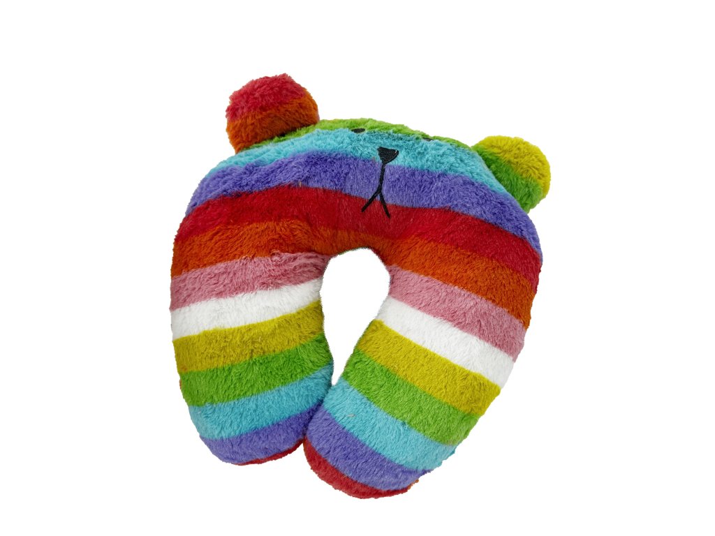 Dětský cestovní polštářek Rainbow 30×30 cm v designu s duhovými proužky je hravý, měkoučký a skvěle padne kolem dětského krku. Díky ergonomickému tvaru ve stylu medvídka a plyšovému povrchu poskytuje maximální pohodlí během cest autem, letadlem nebo i doma u pohádky.