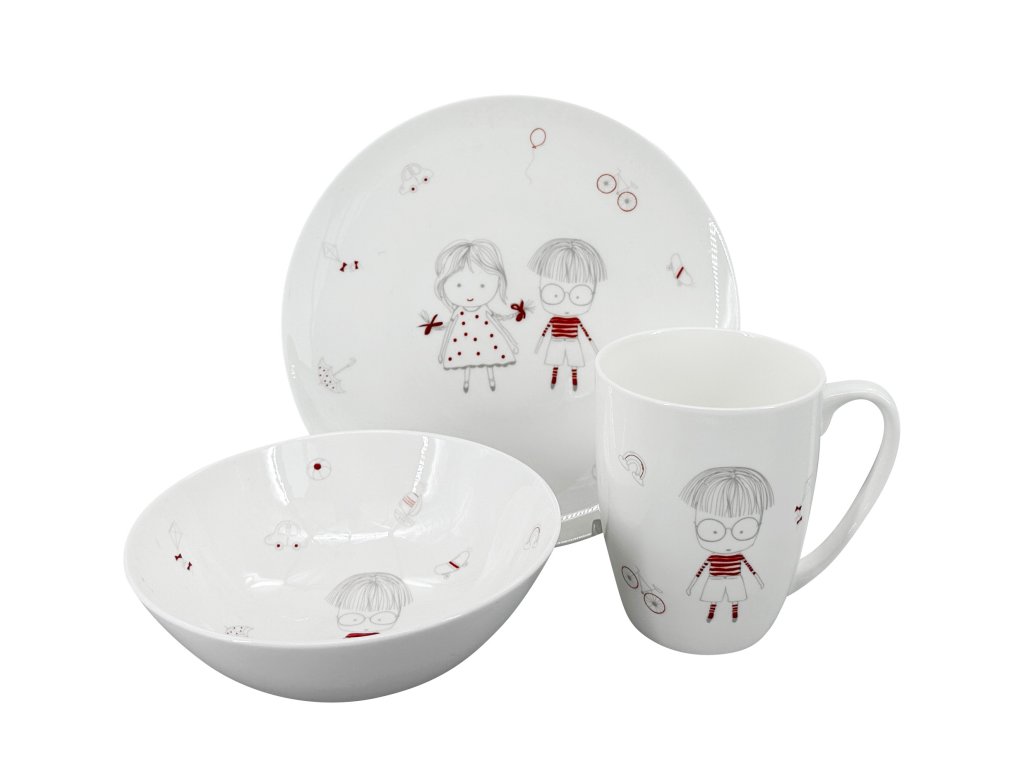 Originální dekor s motivem veselého, rošťáckého chlapečka v červených akcentech je plný drobných hracích prvků – autíček, balonků a dětských postaviček. Ilustrace na hrnku a misce dominuje ústřední postava chlapečka, zatímco talíř zdobí oba kamarádi, chlapec i holčička. Tento design podporuje dětskou fantazii a učí je, že i jídlo může být zábava. Díky kvalitnímu dětskému porcelánu je sada odolná, příjemně hladká a lehká, perfektní pro každodenní použití.