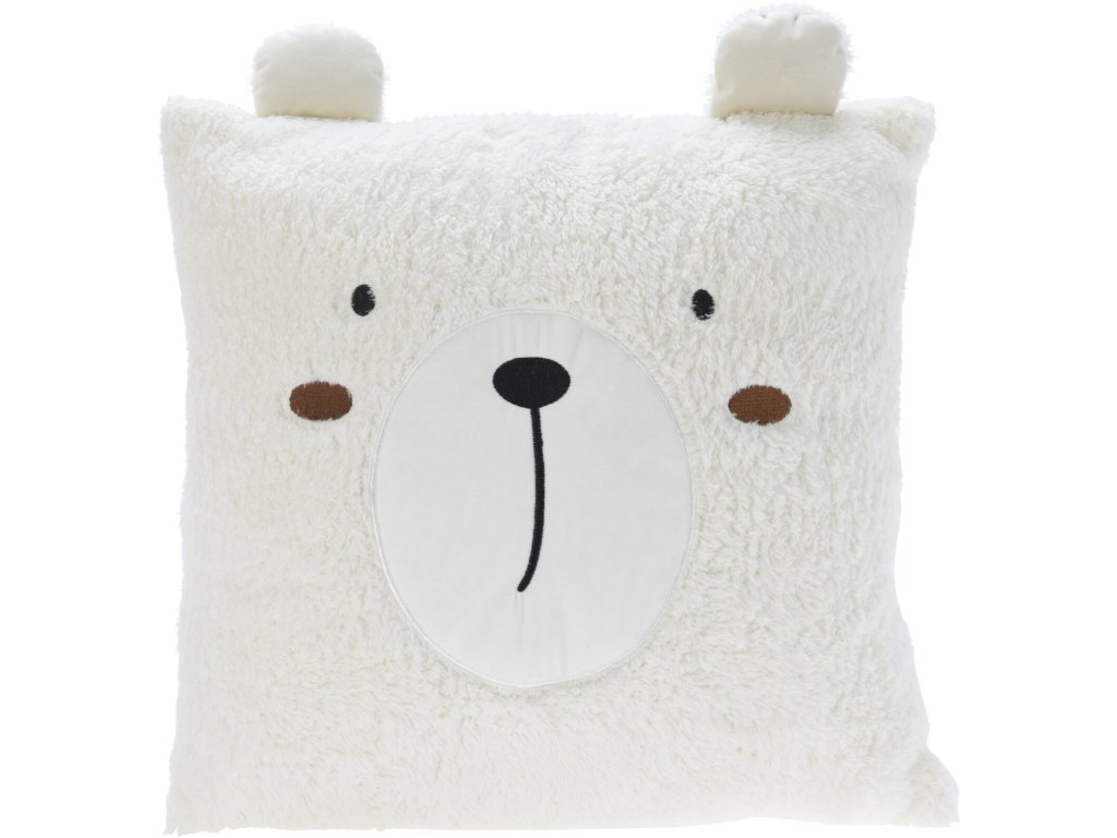 Polštář Medvídek v jemně bílé barvě je ideálním doplňkem do dětského pokoje. Rozměr 43 × 43 cm a ultra jemný materiál z 100% polyesteru zaručují pohodlí i bezpečí při odpočinku. Detaily ve formě oušek a výšivky dodávají medvídkovi osobitý výraz.