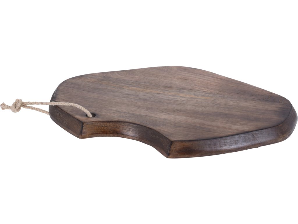 Toto dřevěné servírovací prkénko z mango dřeva o rozměrech 26x36 cm nabízí jedinečný a stylový design s nepravidelným tvarem, který dodává každému servírování osobitý nádech. Vyrobené z tmavého dřeva, vyniká svou výraznou texturou a přirozenými odstíny, které zaručují, že každý kus je originál. Prkénko je nejen funkčním pomocníkem pro servírování sýrů, pečiva či tapas, ale také ozdobou vašeho stolu.