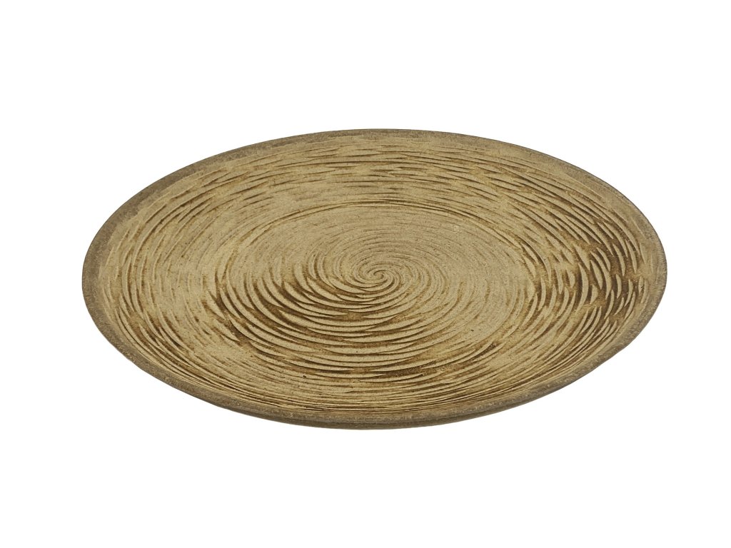 Kulatý podnos s vyrytým zdobením z lisovaného dřeva.