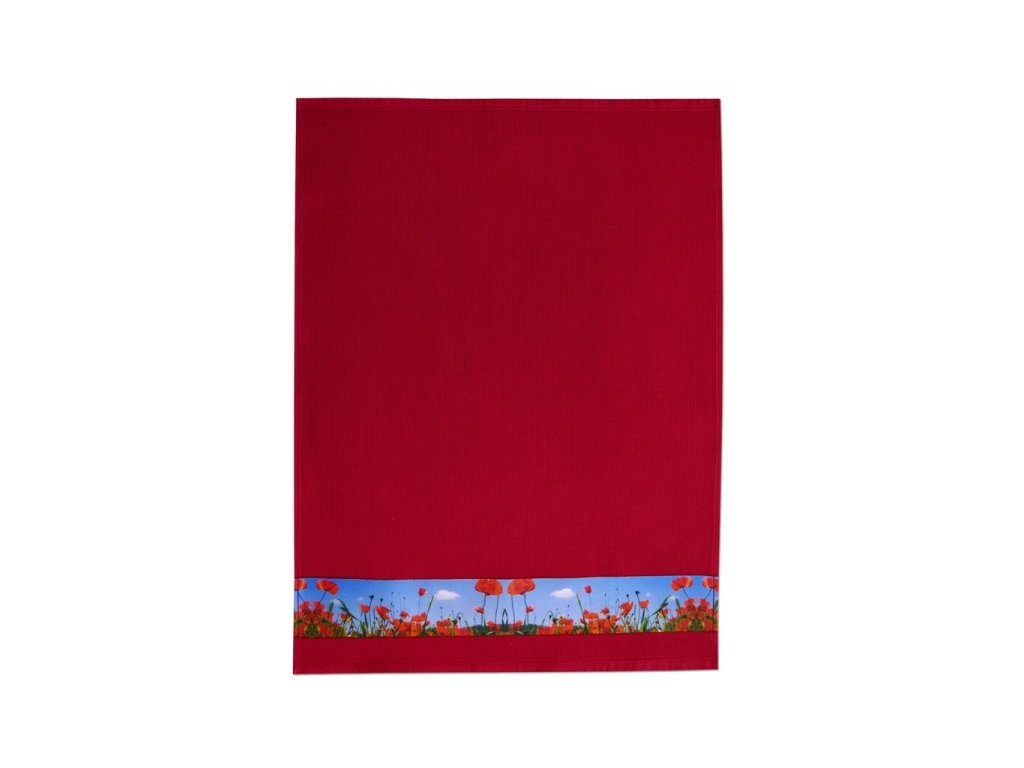Design s motivem makového pole dodává textilu výrazný a dekorativní charakter. Sytý odstín bordeaux působí elegantně a vytváří v kuchyni hřejivou atmosféru.