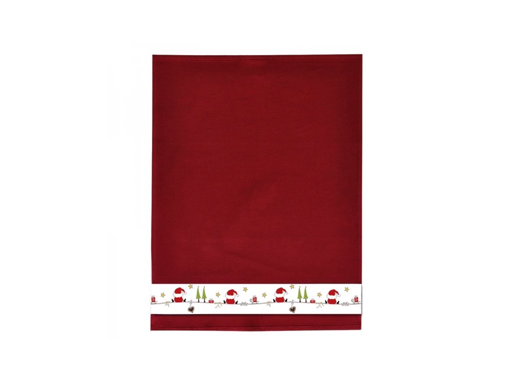 Kuchyňská utěrka s vaflovou vazbou s Vánočním potiskem Santa Clause v červené bordeaux barvě.