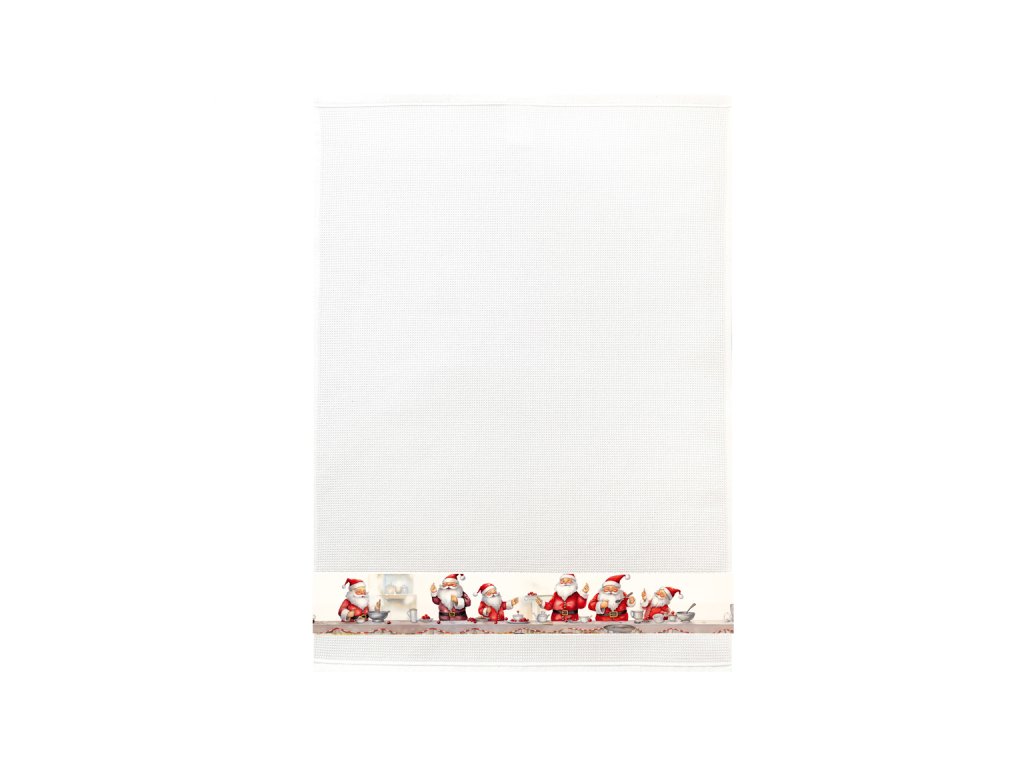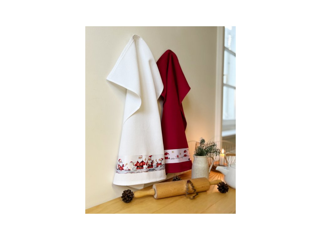 Kuchyňská utěrka s vaflovou vazbou s Vánočním potiskem Vánočních kuchařů v bílé barvě.