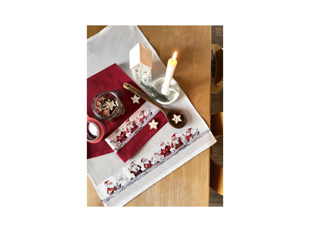 Kuchyňská utěrka s vaflovou vazbou s Vánočním potiskem Vánočních kuchařů v červené barvě.