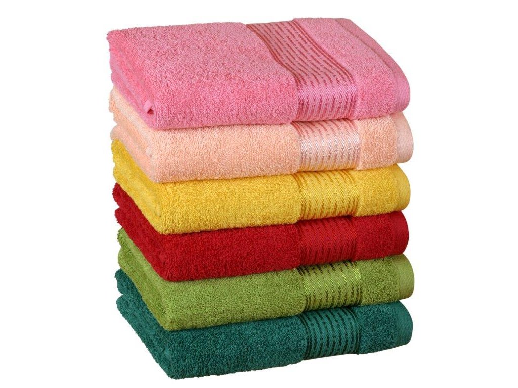 Froté ručníky a osušky s proužkem jsou vyrobeny z bavlněného materiálu a díky jemným přízím jsou velmi příjemné na omak. Charakteristická je i vysoká savost froté materiálu. Každou z barev můžete zkompletovat do barvy ručníku i osušky. Plošná gramáž použitého froté materiálu je 450g/m2.