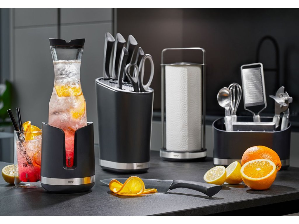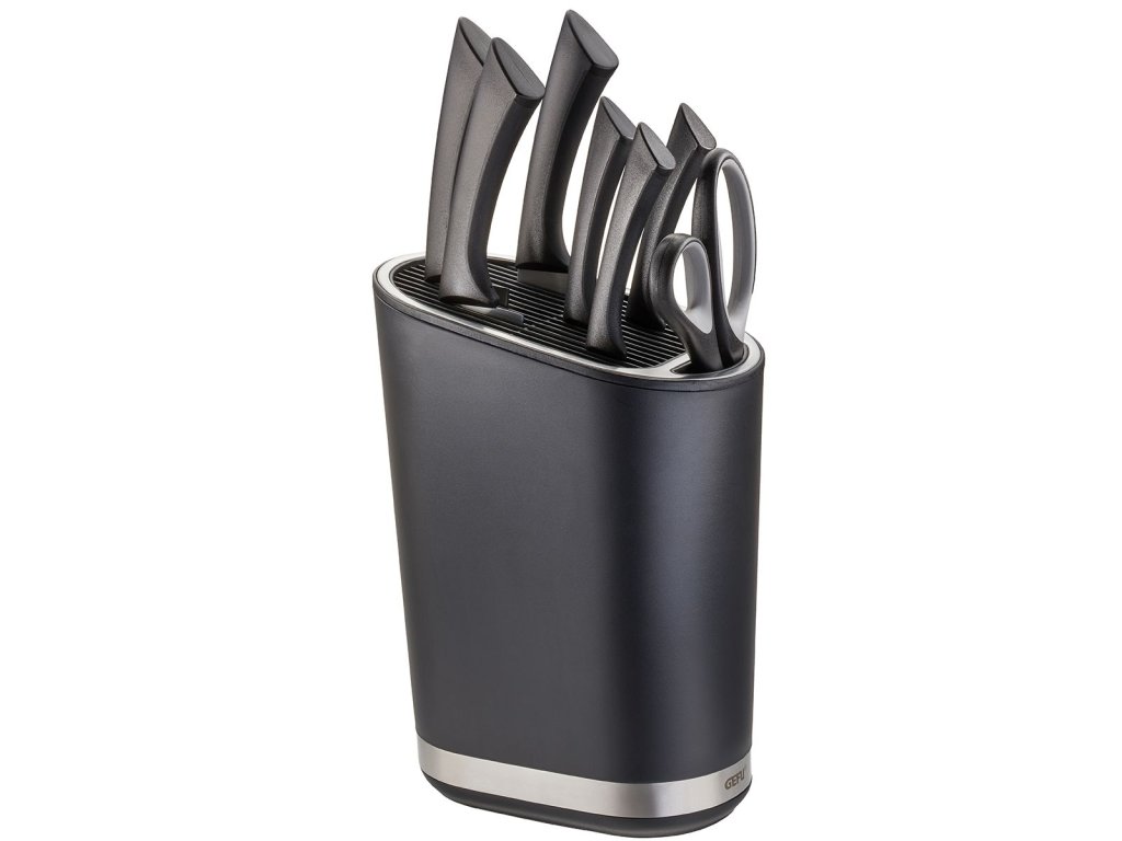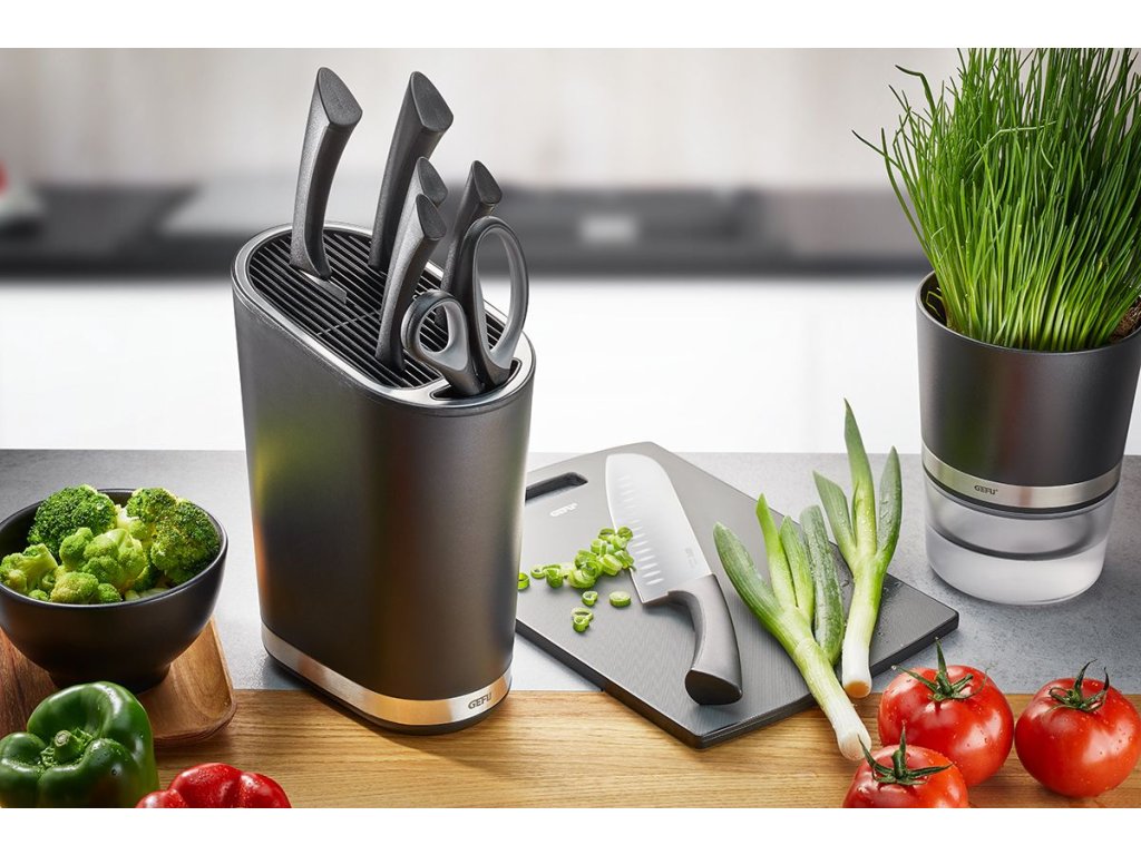 Jedná se o elegantní způsob, jak mít nože vždy po ruce. Těžký blok na nože v elegantní černé barvě s lesklými okraji z nerezové oceli nabízí 28 bezpečných přihrádek na nože různých velikostí a také velkou přední přihrádku na ocílku nebo kuchyňské nůžky.