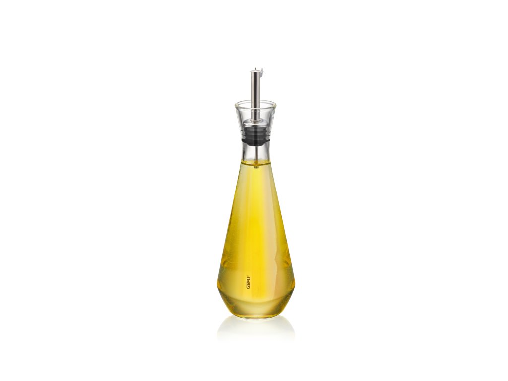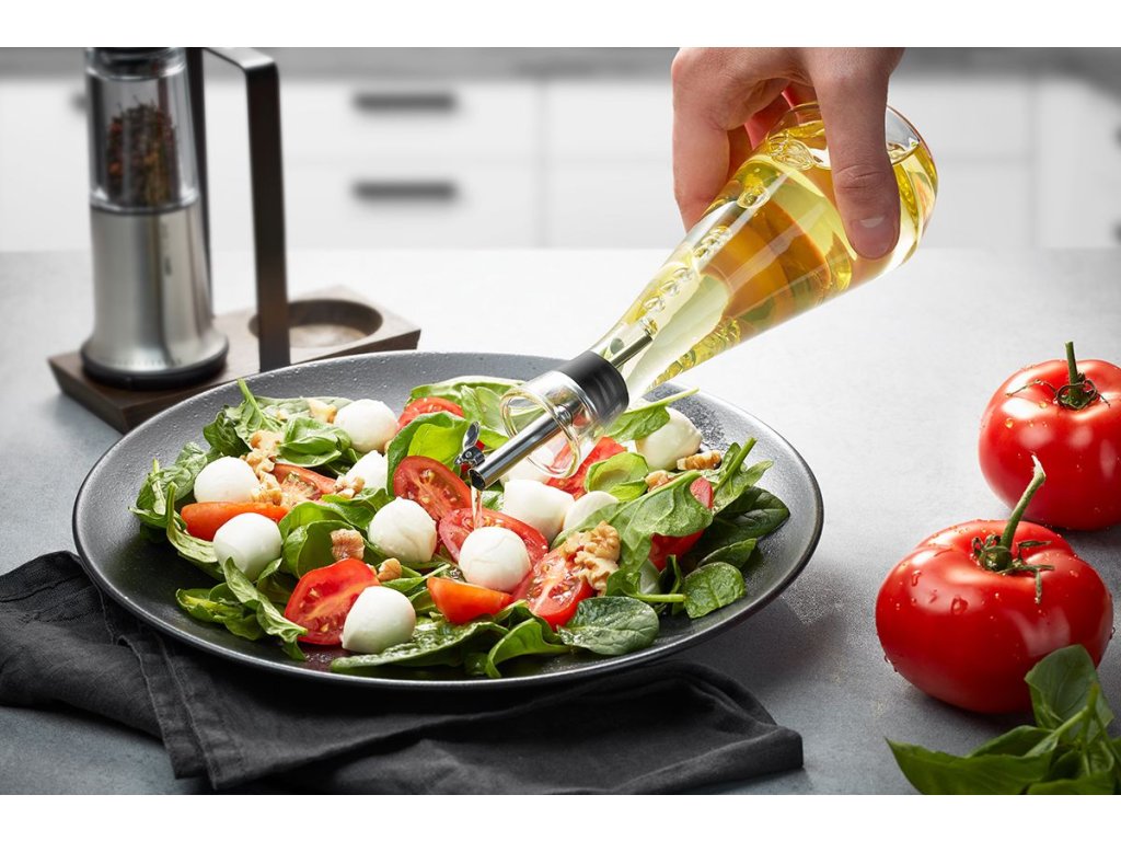 Elegantní dávkovač na ocet nebo olej z křišťálového skla včetně nekapajícího nerezového nálevníku s těsnícím uzávěrem pro snadné dávkování.