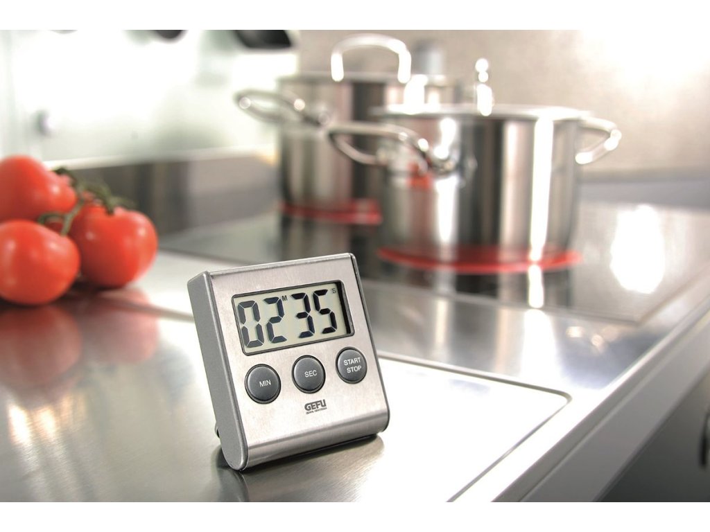 Tento časovač lze nastavit na minuty a sekundy (až 99 minut a 59 sekund). Díky magnetu na zadní straně jej lze snadno připevnit na jakýkoli kovový povrch nebo nastavit pomocí držáku.