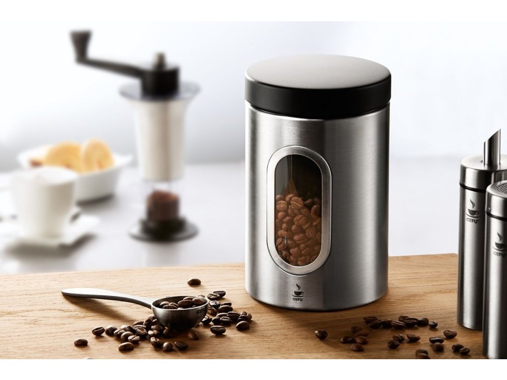 Perfektní úložiště pro kávová zrna a čerstvě mletou kávu: dóza na kávu PIERO z nerezové oceli s uzávěrem na patentní zapínání, díky kterému se zachovává aroma.