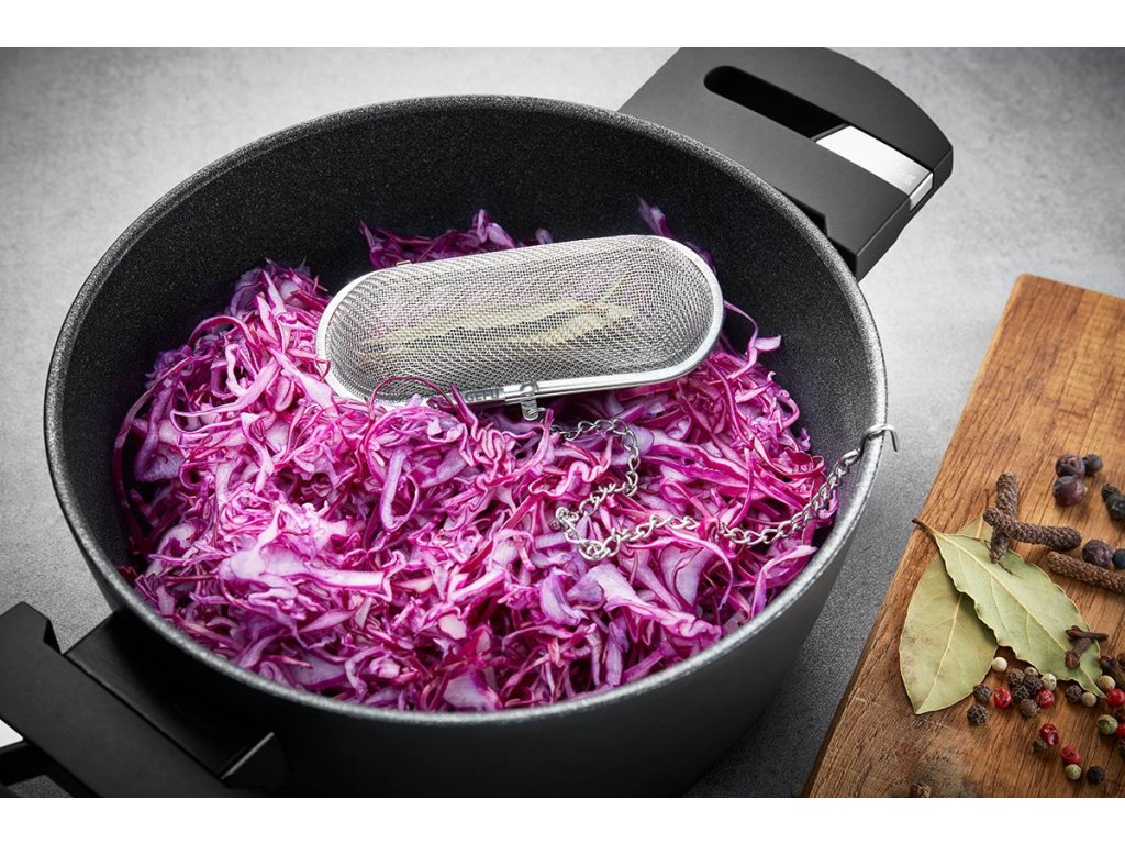 Extra velké sítko na koření pro maximální aroma bylin a koření v lahodných polévkách, vydatných dušených pokrmech nebo voňavém svařeném víně bez nepříjemných zbytků.