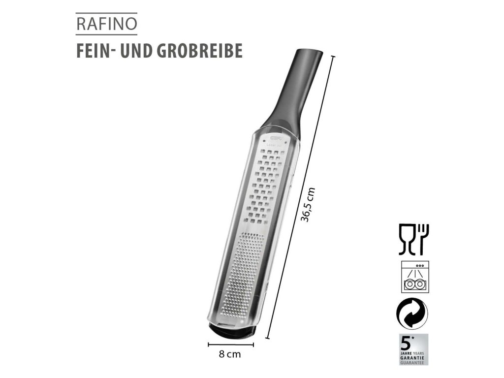 Jemné a hrubé struhadlo RAFINO je ideální pro přípravu jemných vloček nebo strouhaných kousků. Díky dvěma strouhacím plochám s extrémně ostrými LASER CUT čepelemi dosáhnete perfektních výsledků při strouhání parmezánu, zázvoru, čokolády, citronové kůry, mrkve a dalších pevných potravin.