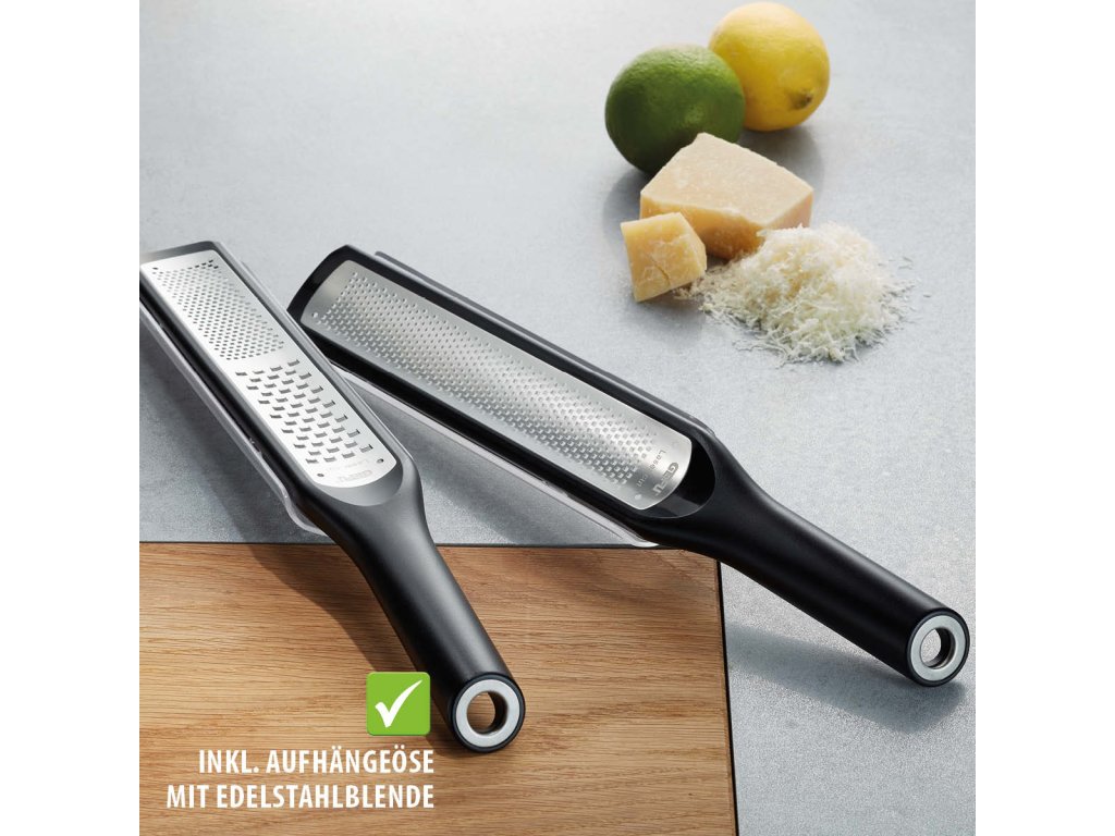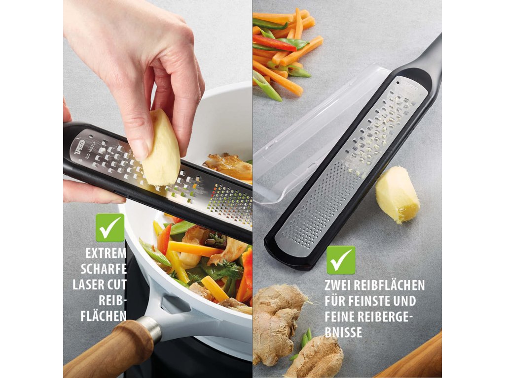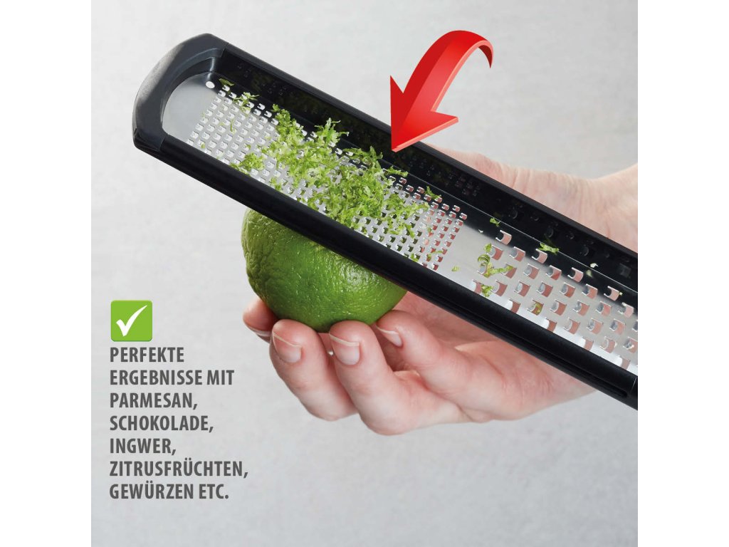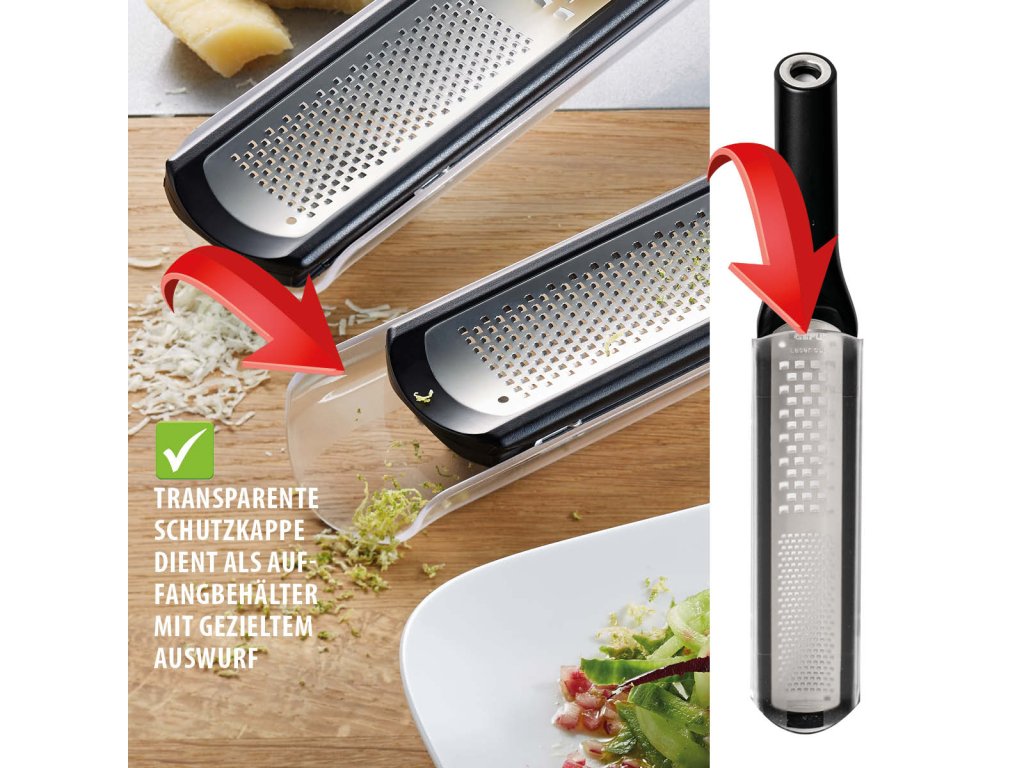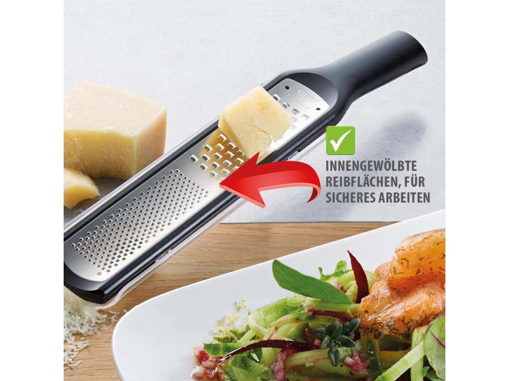 Díky dvěma strouhacím plochám můžete snadno připravit jemné vločky nebo strouhané kousky z různých potravin. Zakřivené strouhací plochy s ostrými LASER CUT čepelemi zabraňují sklouznutí potravin. Ochranný kryt slouží jako sběrná nádoba a díky malé otvoru na konci umožňuje přesné dávkování. Ergonomická rukojeť z materiálu Softgrip zajišťuje pohodlné a bezpečné používání.