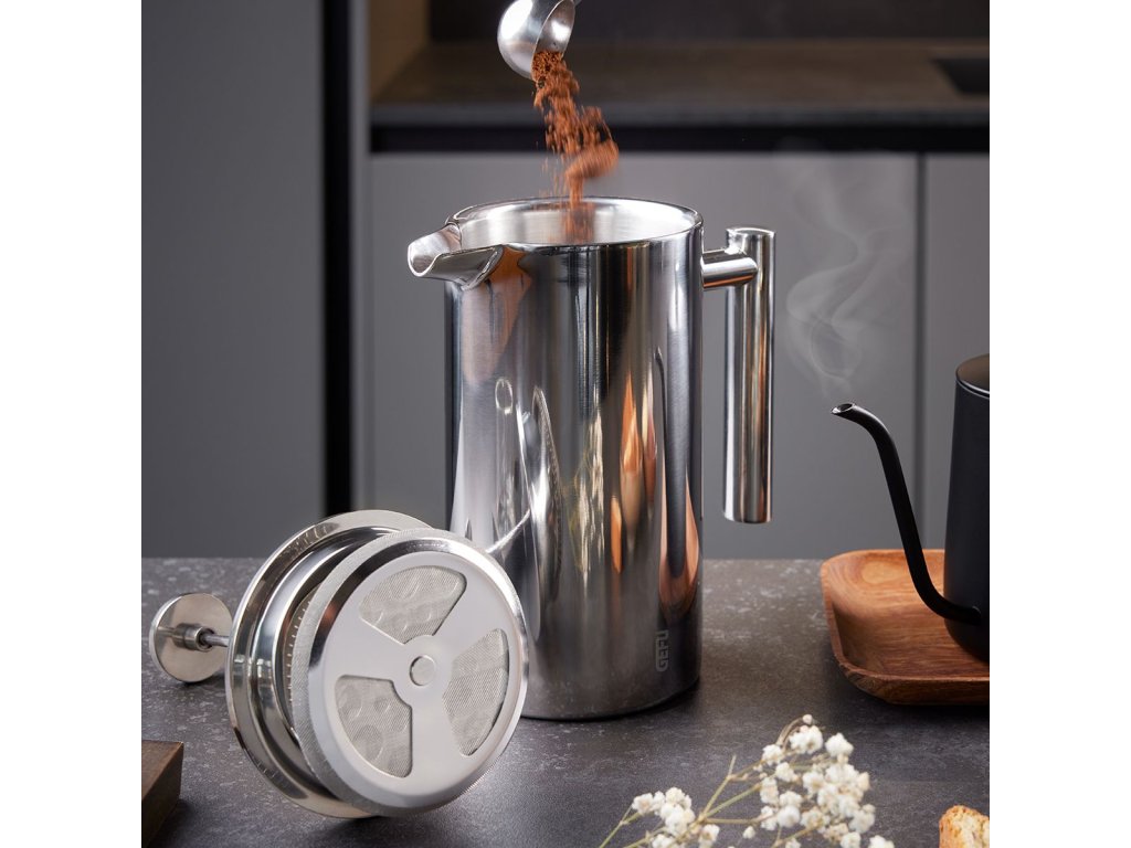 - Systém French press: Přidejte kávový nebo čajový prášek, zalijte vroucí vodou, nechte louhovat, zatlačte filtrační vložku a hotovo!