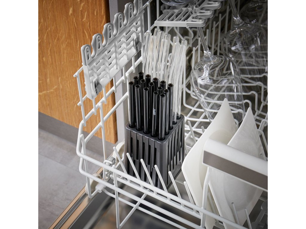 Nic nebrání opakovanému vychutnávání čerstvě vymačkaných šťáv, smoothies atd.: košík na oplachování brček s praktickým upínacím zařízením nabízí bezpečné uchycení brček z nerezové oceli i skla během mycího cyklu v myčce nádobí.