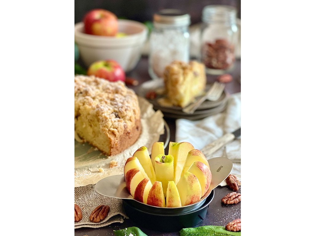 Kráječ rajčat/jablek POMO nakrájí dvanáct rovnoměrných klínků a zároveň odstraní jádřinec i stopku! Čepele vyrobené z japonské oceli krájejí jablka, hrušky a rajčata bez námahy a úsilí díky speciálnímu zoubkovanému ostří. Konstrukce řezného prvku s ergonomickými rukojeťmi umožňuje intuitivní krájení – a prkénko také shromažďuje veškerou unikající šťávu.