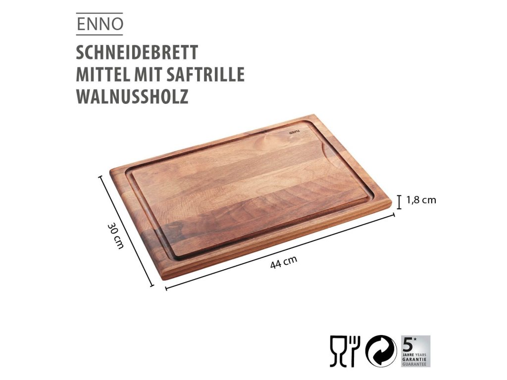 Krájení může být tak krásné. Prkénko ENNO je vyrobeno z elegantního, robustního ořechového dřeva, což dodává každému prkénku jedinečný a vysoce kvalitní vzhled. ENNO je ideální pro snadné krájení ovoce a zeleniny, jako je meloun a rajčata, ale i ryb a šťavnatého masa, a zároveň chrání čepel nože a dělá z něj skutečný klenot v každé kuchyni.