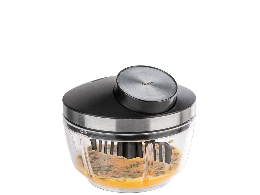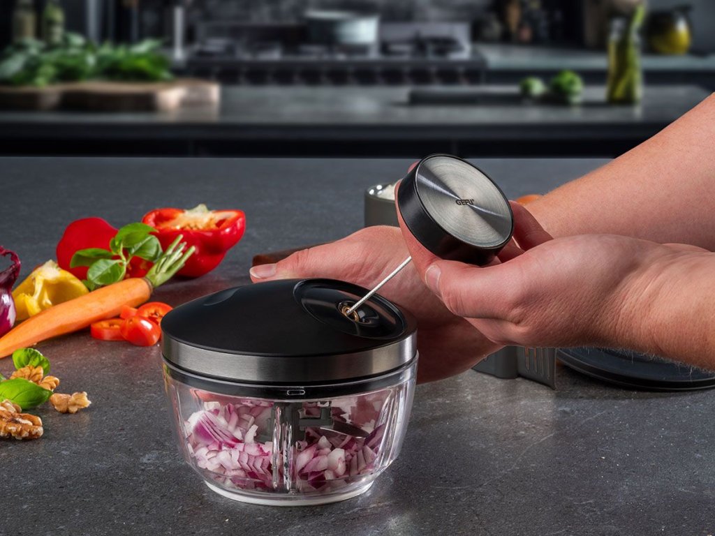 Kompaktní a všestranný, tento multifunkční pomocník bez elektrického napájení snadno zpracovává ovoce a zeleninu, ořechy, cibuli a mnoho dalšího. Míchání a příprava dipů až po dezerty jsou pro efektivní multizerkleinerer hračkou. Díky mechanismu s tažným lanem je efektivní sekání, mixování, šlehání a míchání různých ingrediencí otázkou okamžiku a bez velkého úsilí. V závislosti na délce použití lze s řezacím nástavcem zpracovat mrkev, ořechy a další suroviny od hrubé až po velmi jemnou konzistenci.