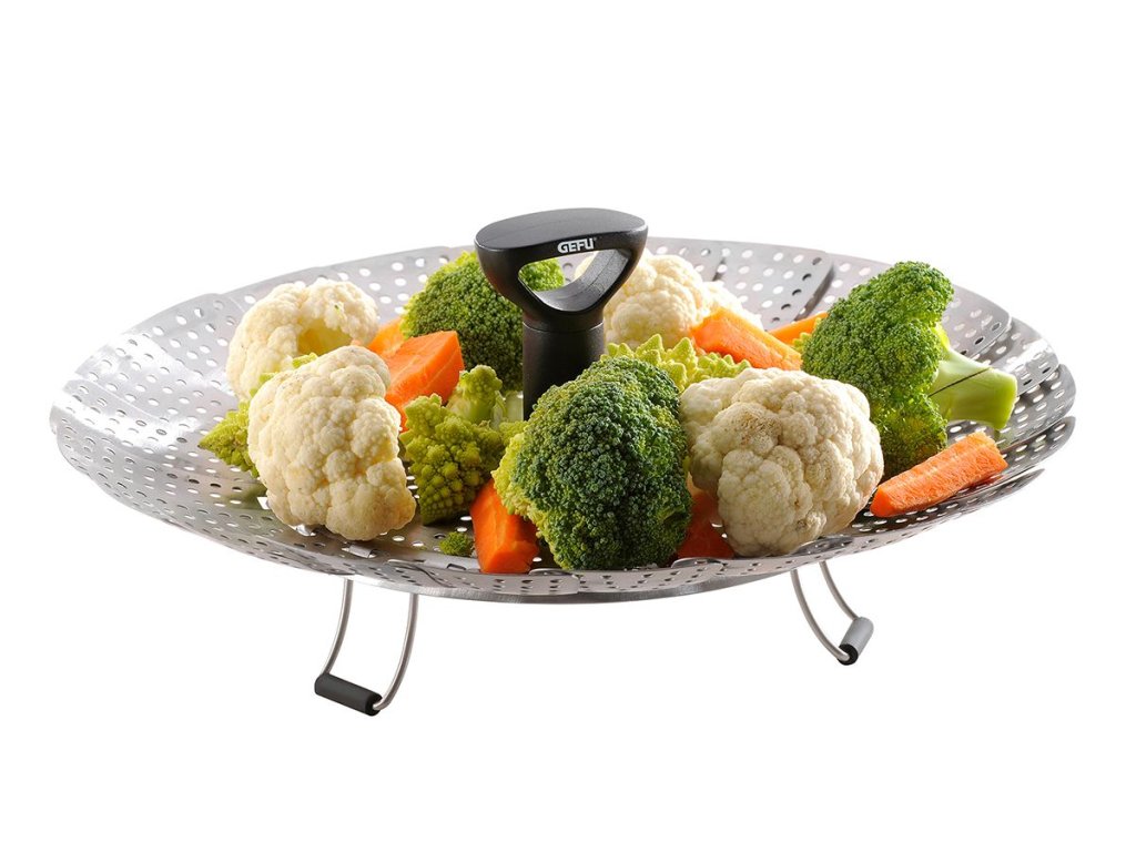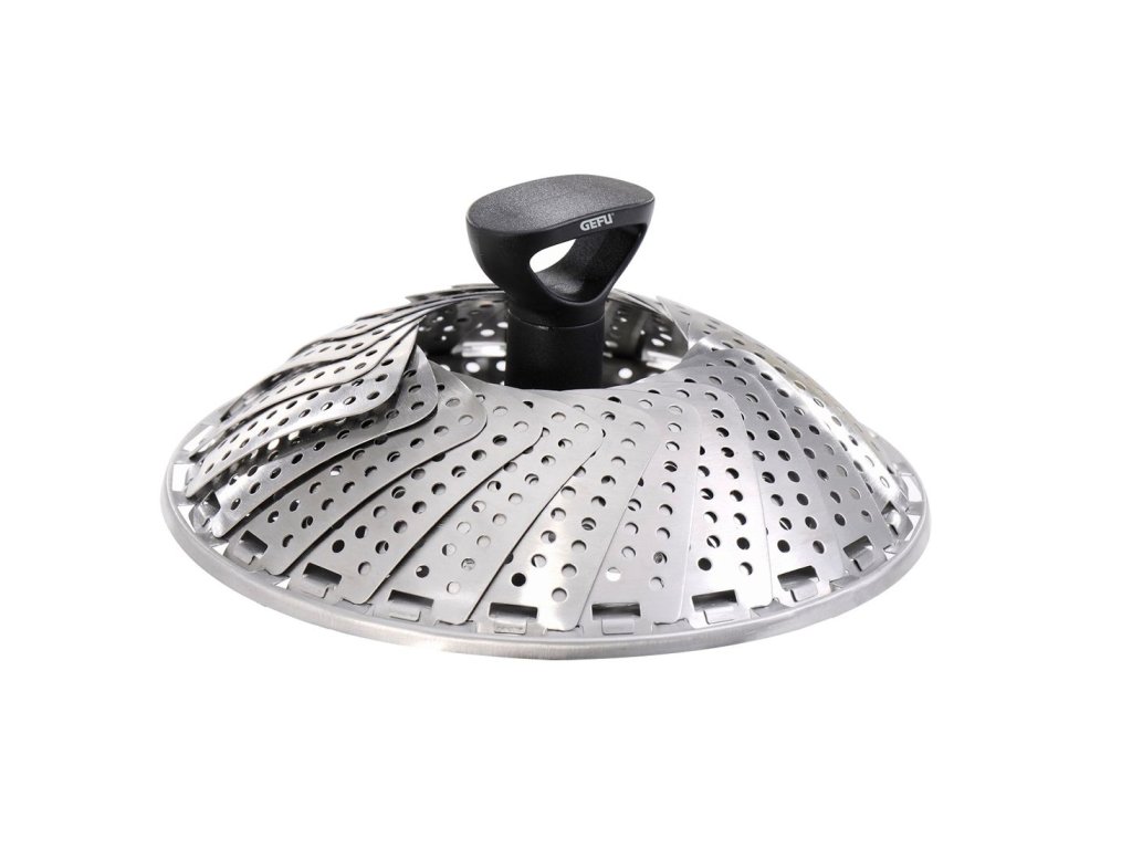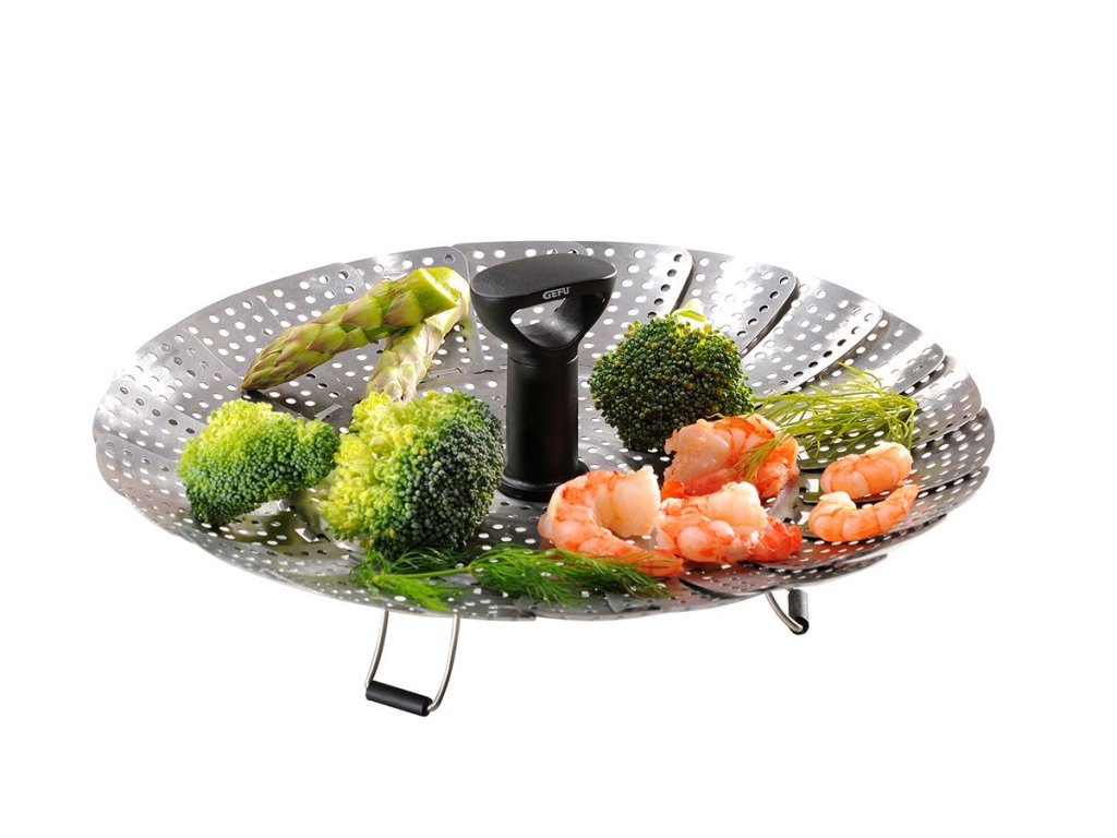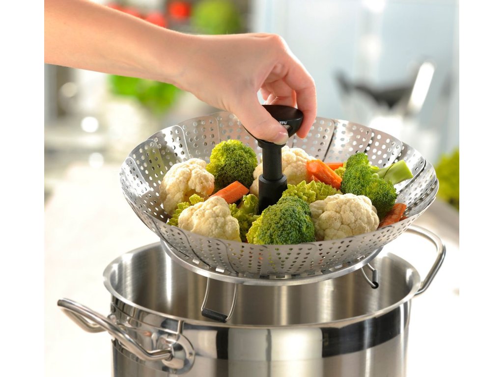 Skládací nožičky se silikonovým povrchem udržují vložku ve správné výšce nad dnem hrnce a zároveň chrání povrch nádobí před poškrábáním. Teleskopická rukojeť zajišťuje bezpečný odstup od horké páry a po složení šetří místo při skladování. Napařování je ideální technikou pro lehkou a dietní kuchyni.
