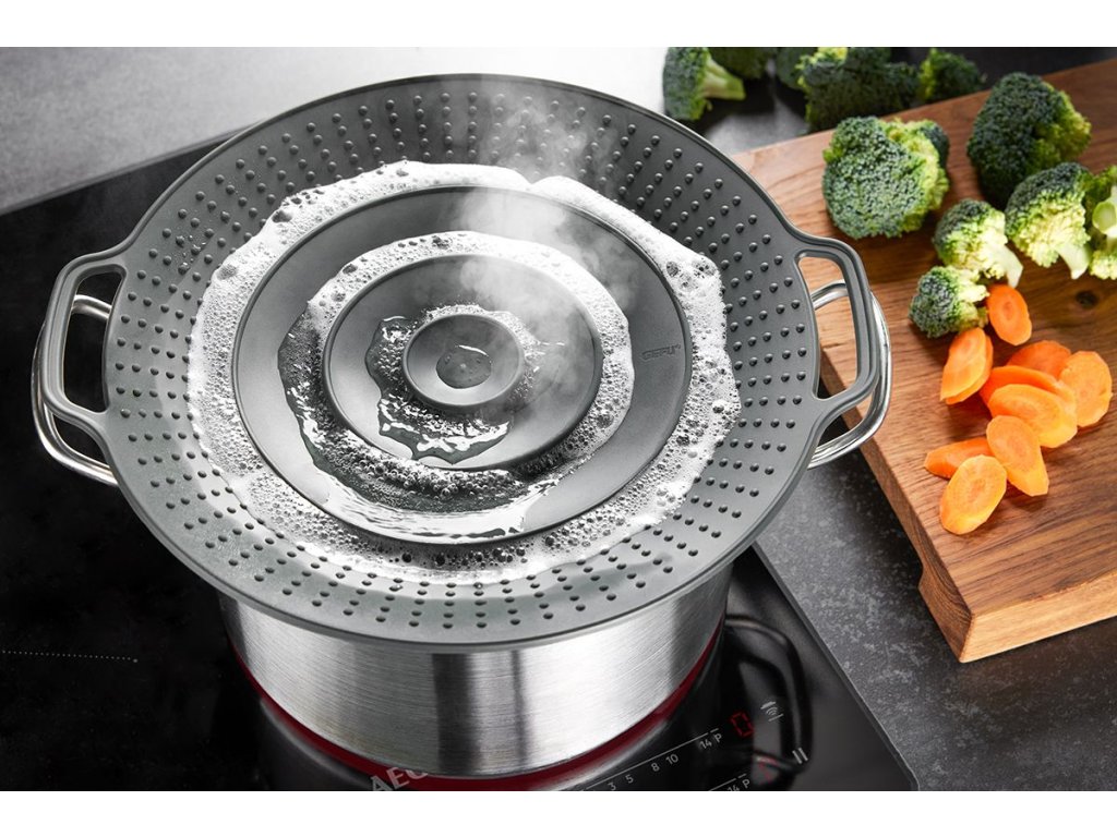 BOLLA, dokonalé řešení proti přetečení! Vroucí tekutiny a pěna jsou okamžitě zachyceny ochranou proti přetečení a stékají přímo zpět do hrnce dříve, než se můžou přetečit – udržuje tak váš sporák čistý. Je také ideální pro vaření zeleniny v páře nebo jako praktická ochrana proti rozstřiku na pánve a do mikrovlnné trouby.
