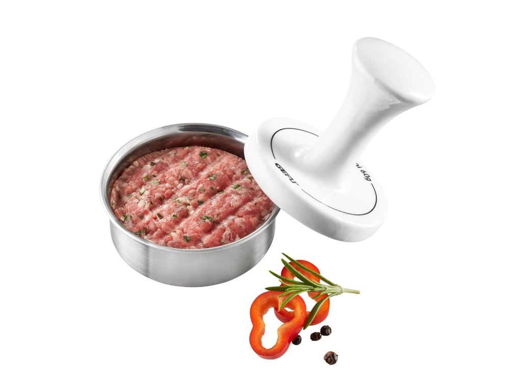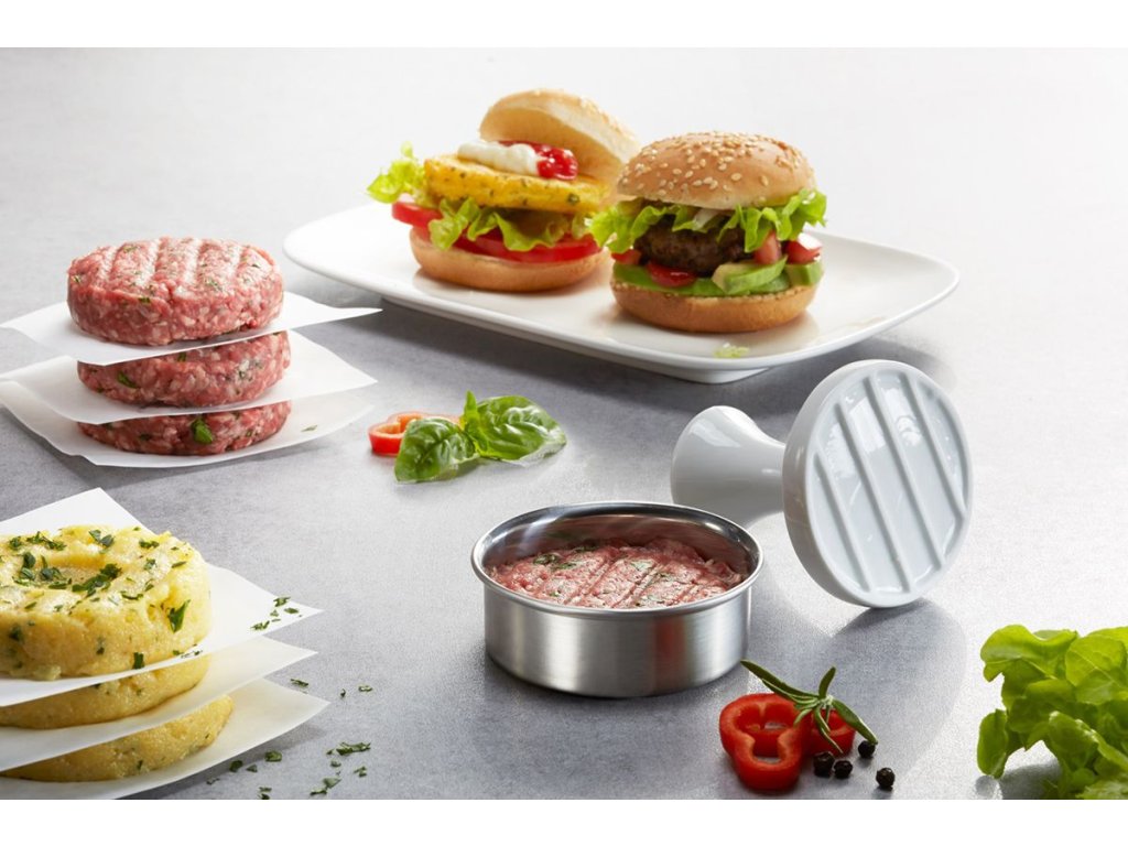 Směs se vloží do zakřivené formy z nerezové oceli a pevně stlačí razítkem, které díky vroubkování vytvoří typický drážkovaný design a zároveň upevní strukturu burgeru. Zakřivené dno formy zabraňuje deformaci placiček při tepelném zpracování, takže si udrží svůj kompaktní tvar i při smažení či pečení.