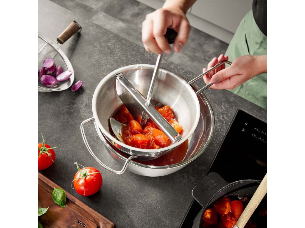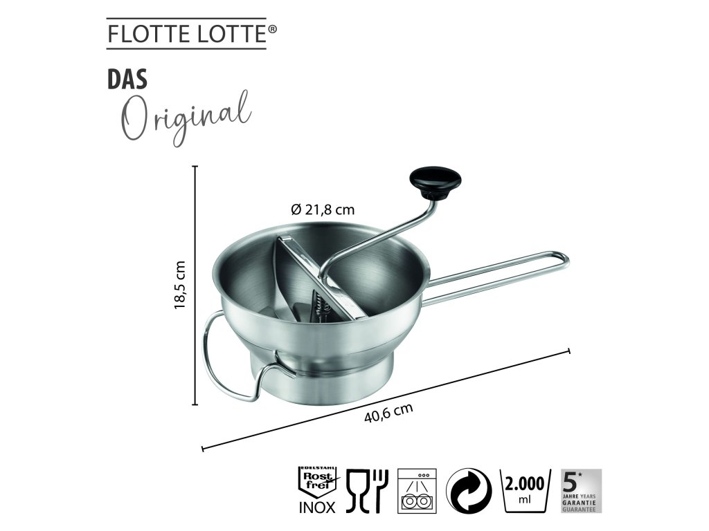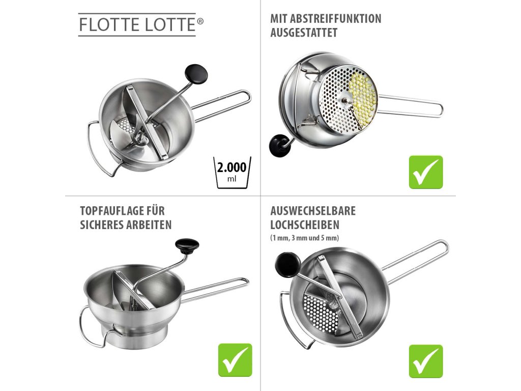 FLOTTE LOTTE® je skutečná kuchyňská klasika pro pasírování a strouhání ovoce a zeleniny! Vyvinutá společností GEFU a vybavená funkcí stírání, je ideálním pomocníkem při přípravě jemných polévek, čerstvého dětského pyré nebo delikátních zeleninových pyré. Různé, snadno vyměnitelné síťky pomáhají při výrobě želé a dalších pokrmů.